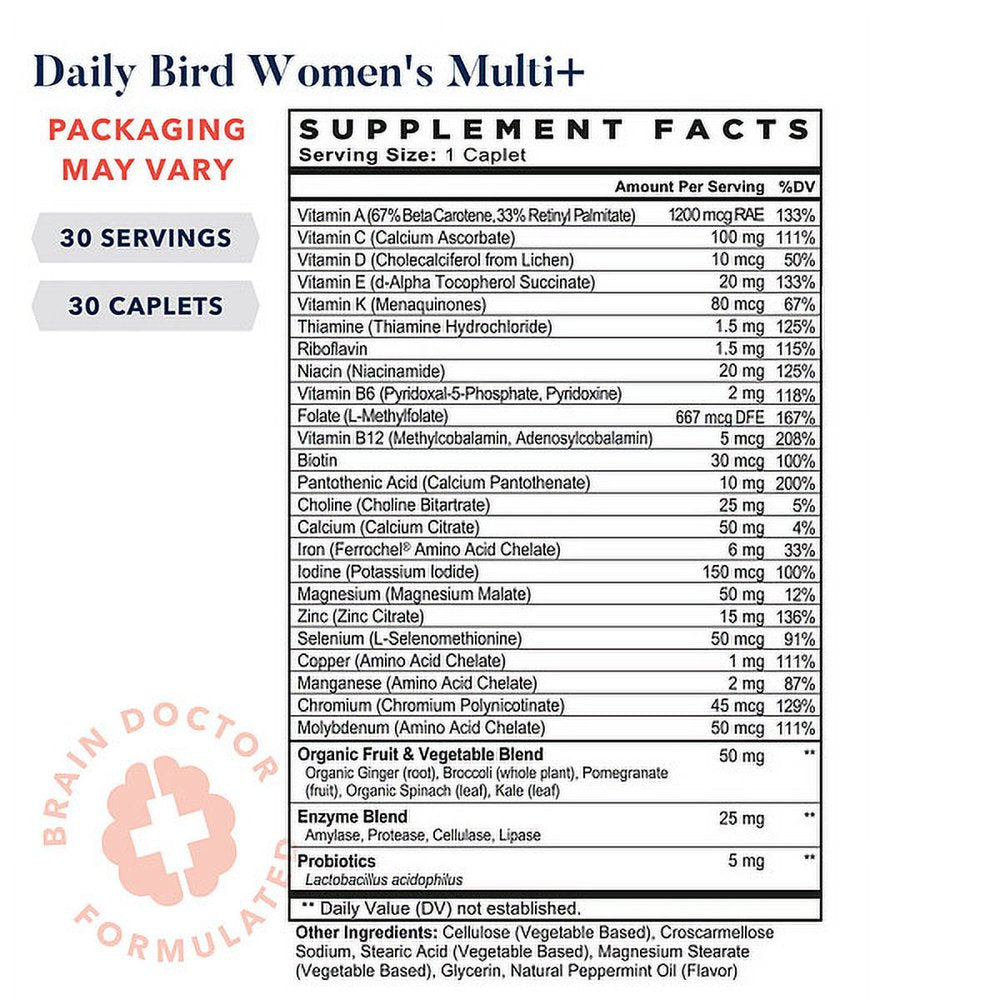 A complete women’s multivitamin with iron and methylated vitamins for women designed to support brain health and energy for a vibrant life. Methylfolate influences healthy neuro-development, improved memory, mood, energy, and restful sleep. Iron helps supply oxygen to the body and the brain, aids in red blood cell production, boosts energy, and supports attention span. Methylcobalamin (vitamin B12) supports the body’s energy production and is needed to make serotonin. Convenient once-daily formula is easy to remember. Natural, vegan, whole-food-based multivitamin. Easy-to-swallow caplet. Best Nest Wellness Daily Bird Multi+, Natural Vegan Multivitamin for Women with Probiotics, B12, 30 Ct