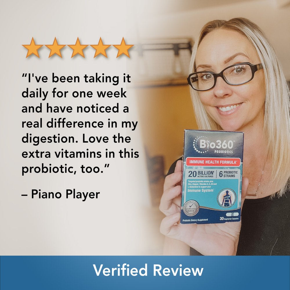Bio360 Probiotics Immune Health Formula helps support and regulates the digestive system's natural flora balance which is an immune booster. Our proprietary immunity support formula combines 20 billion active cultures, 6 targeted probiotic strains and multiple vitamins to help support your body's natural defenses. A weakened immune system cannot protect you against bacteria and viruses. Bio360 Immune Health Formula is specifically formulated to help boost your immune system from the inside out. Zinc, Copper, and Vitamins A, C, and D3 to help boost your immune health. L-Glutamine is a vital fuel source for immune cells living in your digestive tract. Our delayed-release capsules are designed to survive stomach acid and reach your intestinal tract. This multi-tasking probiotic is best for digestive health and immunity support.