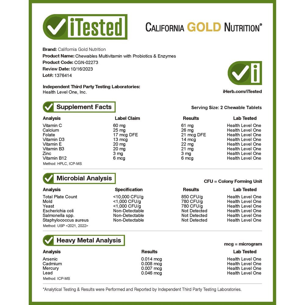 California Gold Nutrition® Kids Multivitamin with Probiotics & Enzymes Chewables Super Chewables for Superheroes! Promotes Overall Wellness, Digestive and Immune Health* Probiotics and Enzymes Essential Fatty Acid Complex Organic Whole Food Blend Phytonutrients and Botanicals Gluten Free, Sweetened with Xylitol Assorted Natural Fruit Flavors 120 Vegetarian Chewable Tablets cGMP Manufactured and Quality Confirmed The key to healthy growth and development for kids are daily essential vitamins, minerals, and other nutrients. This isn’t always simple, as getting your child to eat a healthy diet can be a struggle. Multivitamin with Probiotics & Enzymes Chewables provide a fun, tasty way for your kids to get all the nutrients they need. These chewable multivitamins for children feature a combination of essential vitamins and minerals, including vitamin C, vitamin D, iron, and calcium to help promote overall wellness, as well as probiotics and enzymes to help promote digestive and immune health.* Benefits of Probiotics for Children Probiotics are a type of “good” bacteria that the body needs to help it function. These various “good” bacteria support proper digestion, promote a balanced microbiome, and help increase nutrient absorption. Some studies suggest that probiotics for children may help relieve constipation, colic, and acid reflux.* With daily suggested use or as directed by a healthcare provider, probiotics may help support immune system health and promote healthy digestion.* California Gold Nutrition Kids Multivitamin with Probiotics & Enzymes Chewables are also formulated with an essential fatty acid complex, an organic whole food blend, plus phytonutrients and botanicals. They are gluten free, sweetened with xylitol, and come in assorted natural flavors, including cherry, raspberry, orange, and grape. iTested Verified