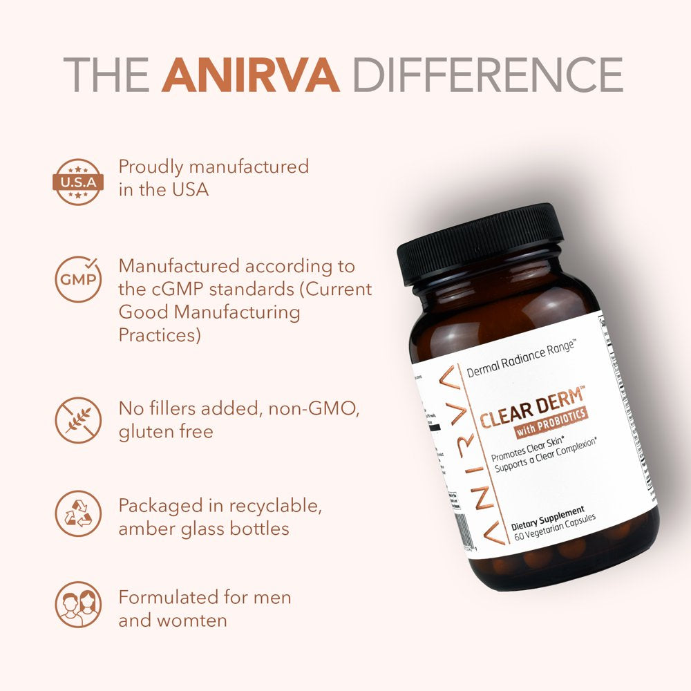 CLEAR DERM WITH PROBIOTICS is an acne pill that was formulated as a hormonal acne treatment and is packed with ingredients known to promote clear skin. The ingredients of this natural acne vitamin is backed by science and recommended by many of the natural healthcare practitioners for clear skin. This acne vitamin is created to combat the blemishes naturally and bring out the glow in your skin. Clear Derm is one of the very few USA made acne vitamin products for hormonal acne in the market. Anirva’s Acne Supplement contains 22 ingredients, including proven natural skin vitamins, probiotics and herbal ingredients that are known to be natural acne treatment. Anirva’s acne pill contains 22 ingredients including green tea, yellow dock, burdock, bromelain and zinc that are known to be essential for a clear complexion. In addition, Anirva’s Clear Derm is the only acne product that has scientifically researched 6 probiotics included in the formulation. Botanical ingredients such as curcumin, quercetin, and grape seed have anti-inflammatory properties that all work together to help keep skin clear and enhance skin quality from the inside out.