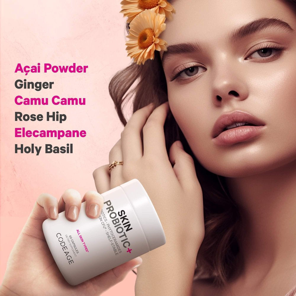 - SKIN CARE: Codeage Skin Probiotic supplement offers an all-in-one premium probiotic supplement specifically formulated to support your skin. This advanced formula features 19 strains of probiotics with 50 Billion CFUs* per serving. This probiotics and prebiotics formula also provides phytoceramides and botanical herbs rooted in Ayurveda.