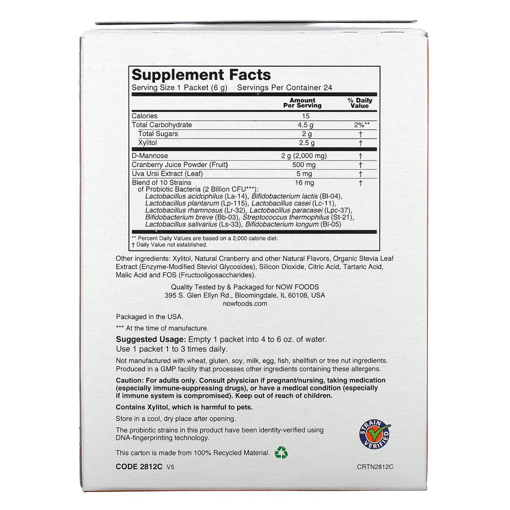 Supports a Healthy Urinary Tract With 10 Probiotics Strains to Support Healthy Microbial Balance Cleanses the Bladder Strain Verified A Dietary Supplement Vegetarian/Vegan Kosher General Health Helps Support Healthy Microbial Balance No Artificial Colors or Flavors Beneficial for Both Women and Men NOW® Cranberry Mannose Packets is a women's probiotic formula with cranberry and D-mannose, which are two well-researched ingredients for urinary tract care. Our immune-supporting blend of 10 probiotic bacterial strains assists in the maintenance of a woman's delicate microbial balance. Cranberries naturally possess flavonoids and other bioactive components that can also promote normal urinary tract ecology by helping to maintain a healthy mucosal surface within the bladder. D-Mannose is a naturally occurring simple sugar that is metabolized only in small amounts by the body, with the remainder being rapidly excreted with the urine. Because insubstantial amounts of D-Mannose are used by the body, it does not interfere with healthy blood sugar regulation. In the urinary tract, D-mannose complements the body's natural elimination process by maintaining a healthy environment in the bladder. Clinical studies have demonstrated that when taken regularly, D-mannose can help to maintain the health of the urinary tract. The probiotic strains in this product have been identity-verified using DNA-fingerprinting technology.