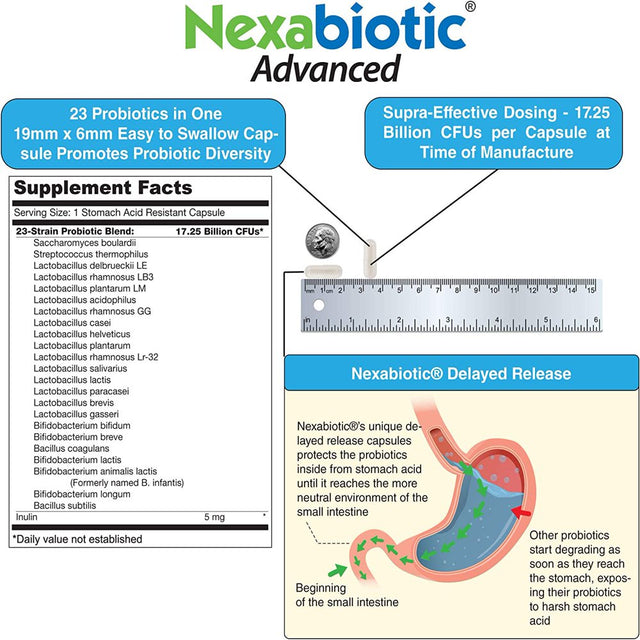 - ADVANCED - Nexabiotic is DrFormulas' best 23 strain multi probiotic containing Saccharomyces boulardii, Lactobacillus acidophilus and 21 other probiotics with prebiotic.
