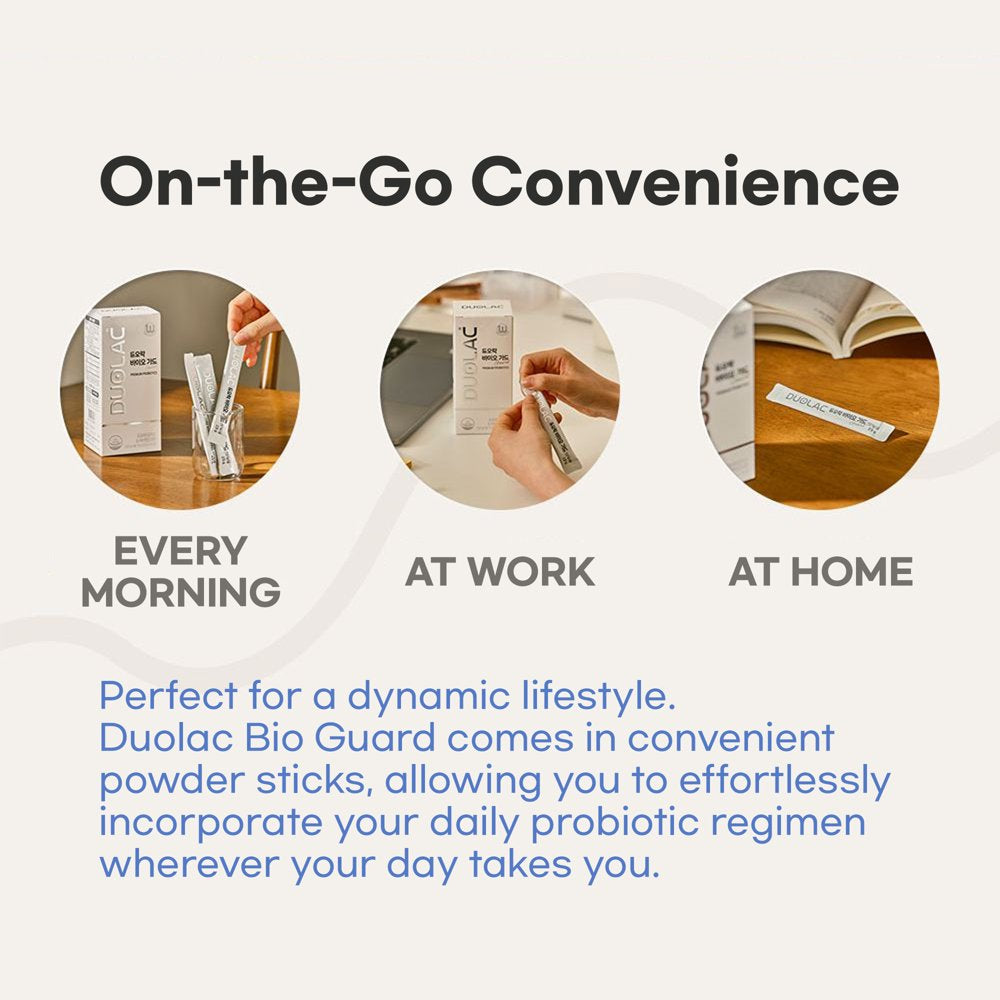 On-the-Go Convenience: Designed for your active lifestyle, Duolac Bio Guard comes in convenient powder sticks, allowing you to effortlessly incorporate your daily gut health regimen wherever your day takes you. The perfect travel companion for those who prioritize their digestive health.