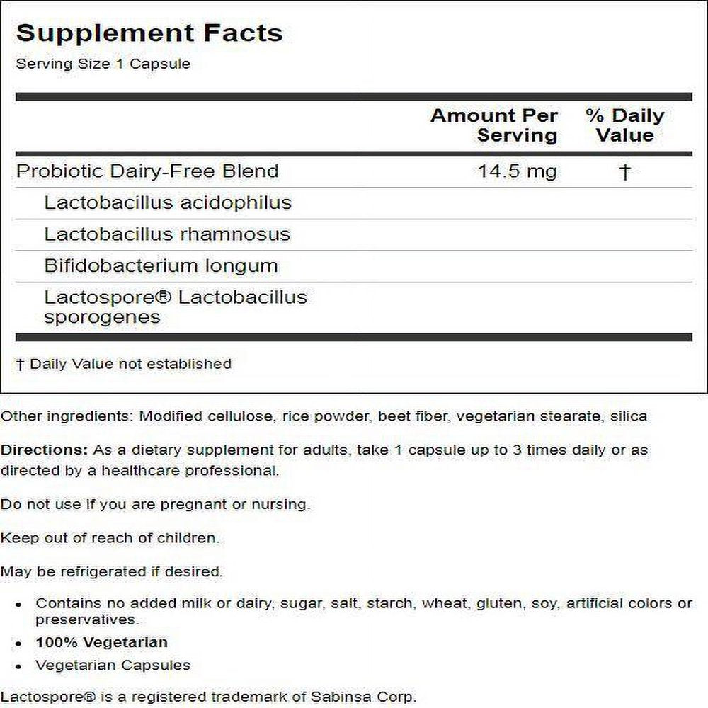 Over 1 Billion Dairy-Free Organisms per capsuleSupports Healthy Intestinal Flora BalanceNow 100% VegetarianFuturebiotics Longest Living Acidophilus includes potent Lactospore?. Delivering viable live probiotics to the intestinal tract is a formidable technical challenge. lactospore? is a naturally microencapsulated sporiferous preparation of Lactobacillus sporogenes that is proven to deliver viable lactobacilli to the intestine. It is room-temperature stable and highly resistant to the action of heat, gastric acids and bile. In addition, Lactobacillus acidophilus and rhamnosus alone with bifdobacterium longum are included, which together with Lactospore?, provides over 1 billion organisms per capsule and supports health intestinal flora balance. Directions As a dietary supplement for adults, take 1 capsule up to 3 times daily or as directed by a healthcare professional. May be refrigerated if desired. Free Of Added milk or dairy, sugar, salt, starch, wheat, gluten, soy, artificial colors or preservatives. Disclaimer These statements have not been evaluated by the FDA. These products are not intended to diagnose, treat, cure, or prevent any disease.