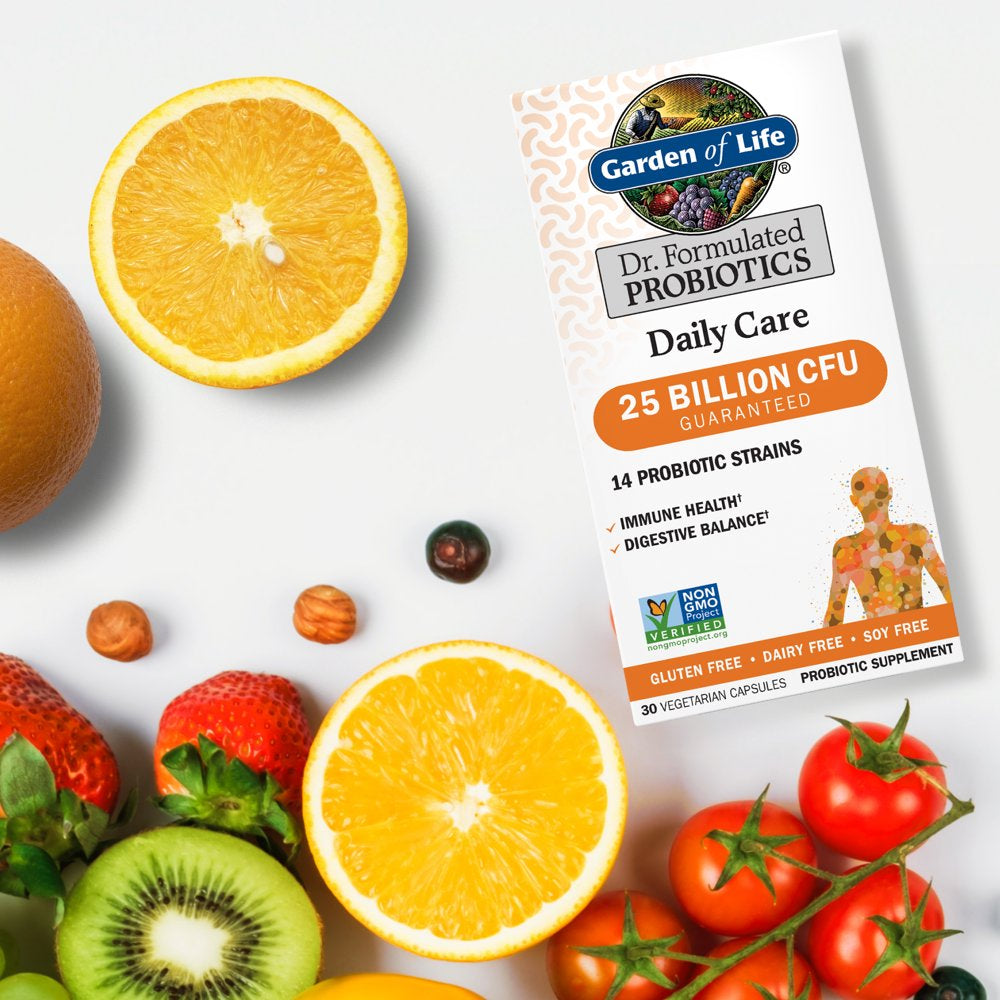 Developed by Dr. David Perlmutter, Garden of Life Dr. Formulated Daily Care Probiotics 30ct. is a once-daily capsule designed specifically to support a healthy microbiome. Its unique formula contains 25 billion CFU of beneficial probiotics made from 14 diverse strains that are resistant to stomach acid and bile, which supports daily digestive and immune system health, and promotes regularity while relieving occasional discomfort.† Dr. Formulated Probiotics Daily Care Probiotics are Vegetarian, NSF Certified Gluten Free, and Non-GMO Project Verified.