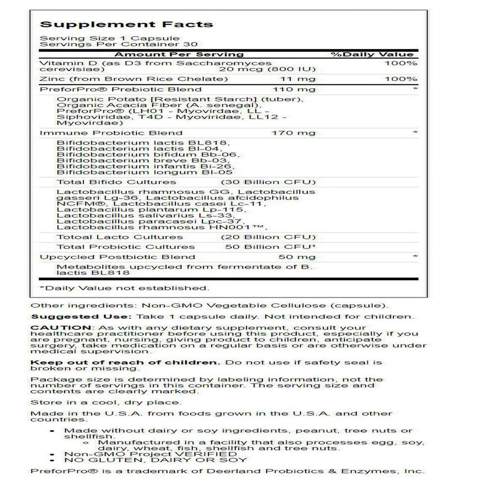 Garden of Life - Dr. Formulated Probiotics Immune 50 Billion CFU - 30 Vegetarian Capsules This is a powerful triple-action formula for those looking to support their immune system and digestive health. Dr. Formulated Probiotics Immune is special since it not only contains 50 Billion CFU of diverse strains per serving, but also provides a prebiotic blend to promote the growth of good bacteria—super important to support a healthy microbiome.