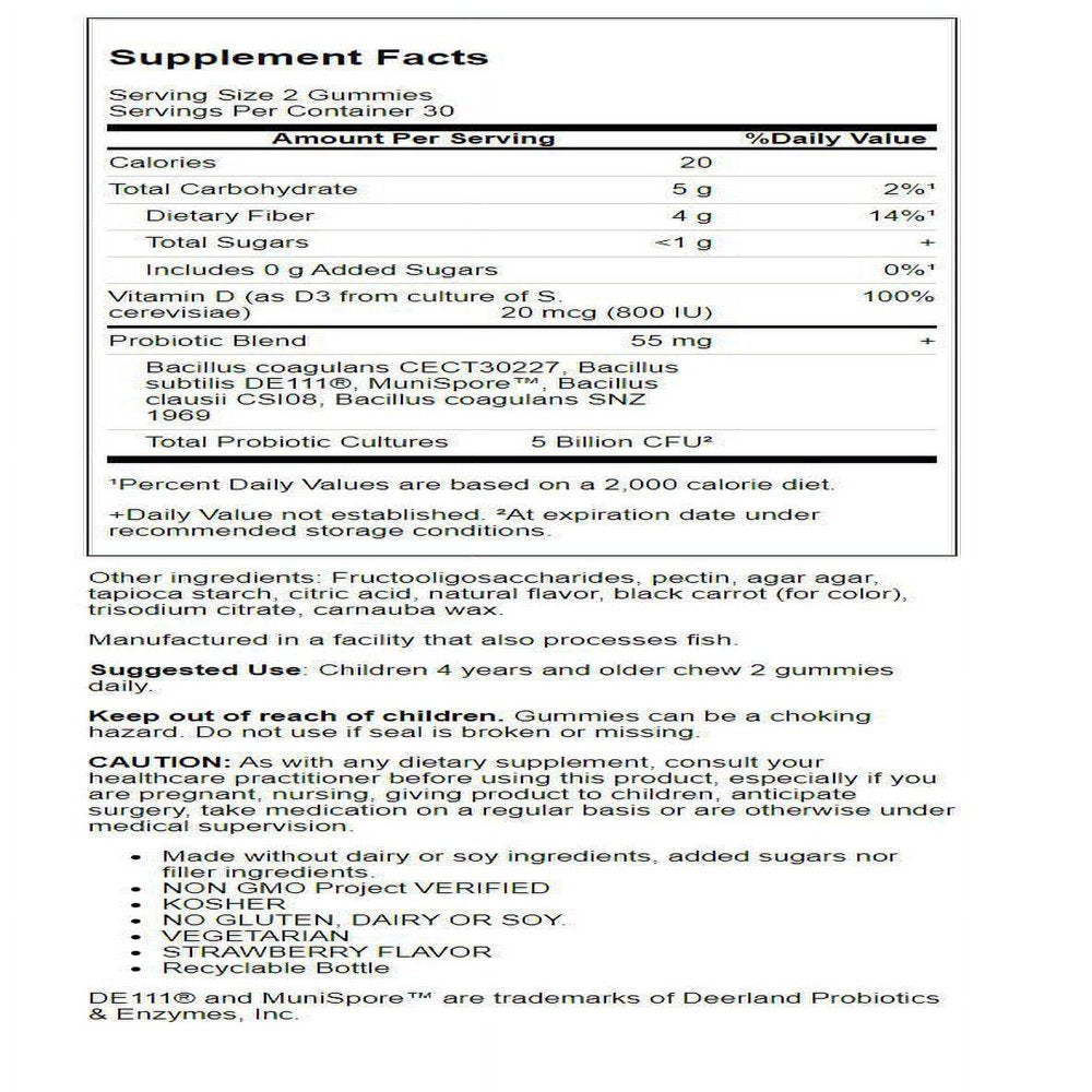 Build a foundation of health and wellness for your kids with Garden of Life Dr. Formulated Probiotics Kids. This science-backed formula delivers 5 billion CFU probiotics--including strains of B. coagulans and B. subtilis--in every two-gummy serving. Featuring a yummy natural strawberry flavor, these gummies also include prebiotic fiber from fructooligosaccharides (FOS) to promote a balanced microbiome in which healthy bacteria can flourish to support digestive, immune and even mood health. The health benefits of Garden of Life Dr. Formulated Probiotics Kids continue with 800 IU of vitamin D in each serving. This vitamin is known to support immune health and, combined with the immune-promoting benefits of probiotics, helps ensure your kids' immune systems have the tools needed for peak performance. Suitable for children over age 4.