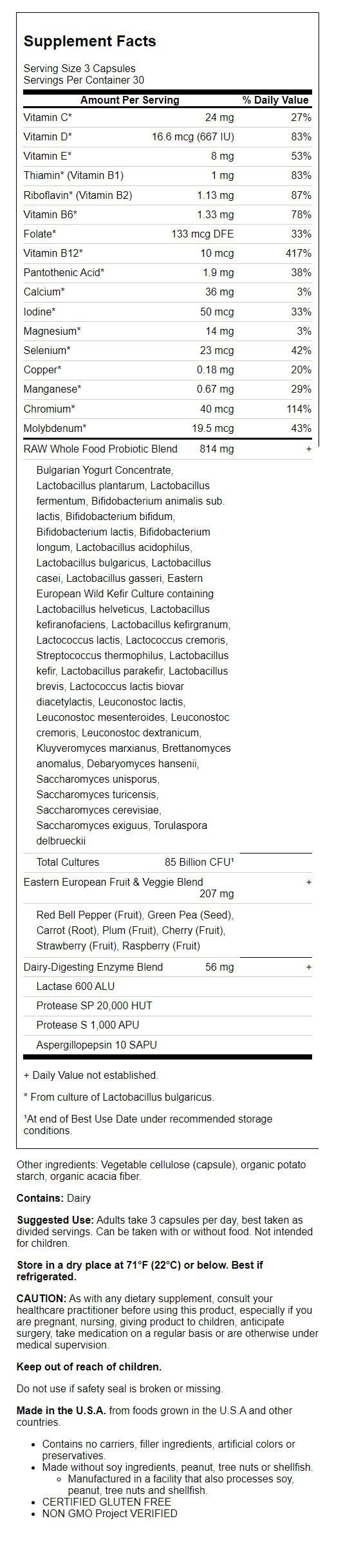 - Digestive Enzyme Supplement: Delivers probiotic-created vitamins, minerals, and prebiotics as well as dairy-digesting enzymes to help break down lactose and casein. This probiotic supplement is vegetarian, RAW, gluten free, soy free, and non-GMO with no binders, filler, carriers, or soy allergens.