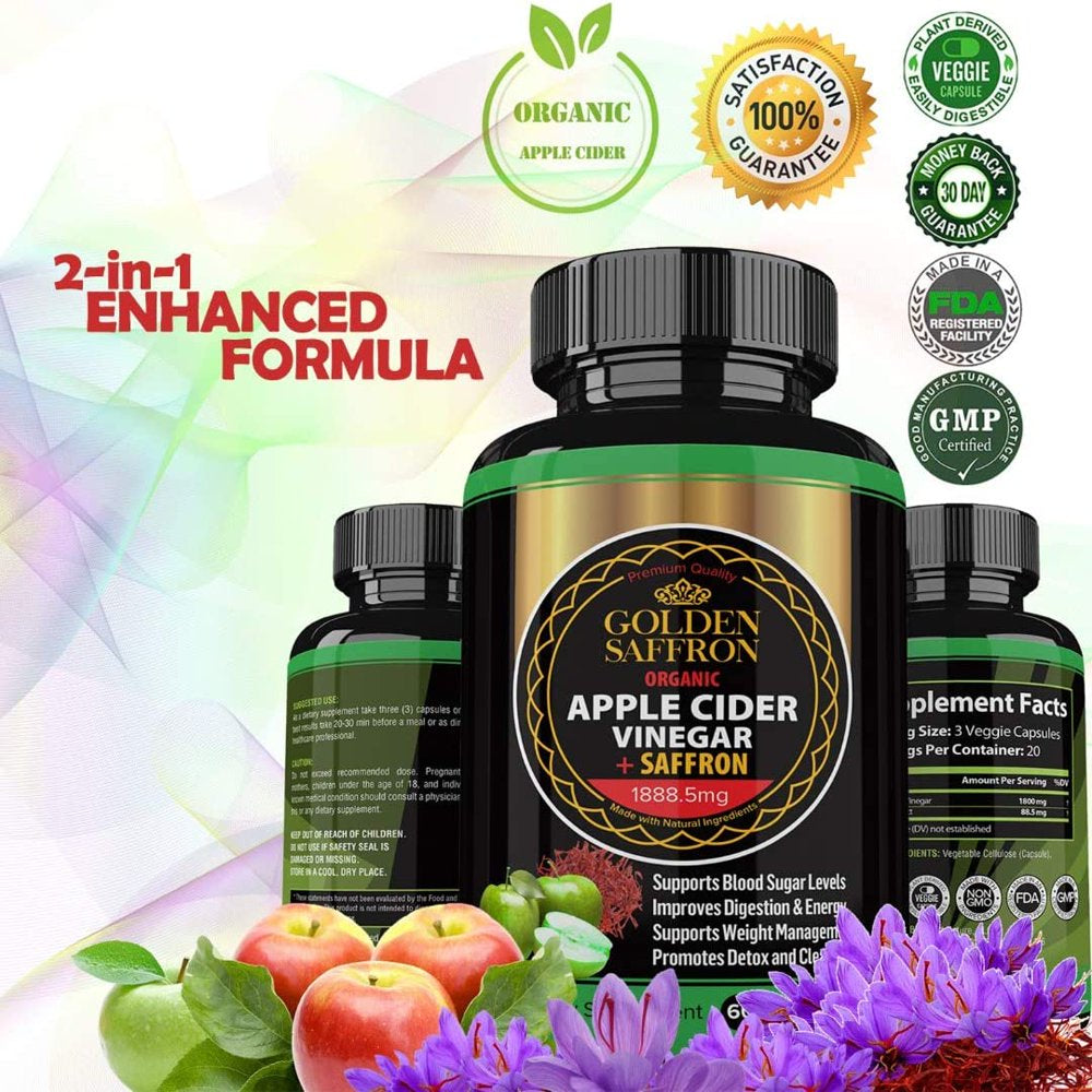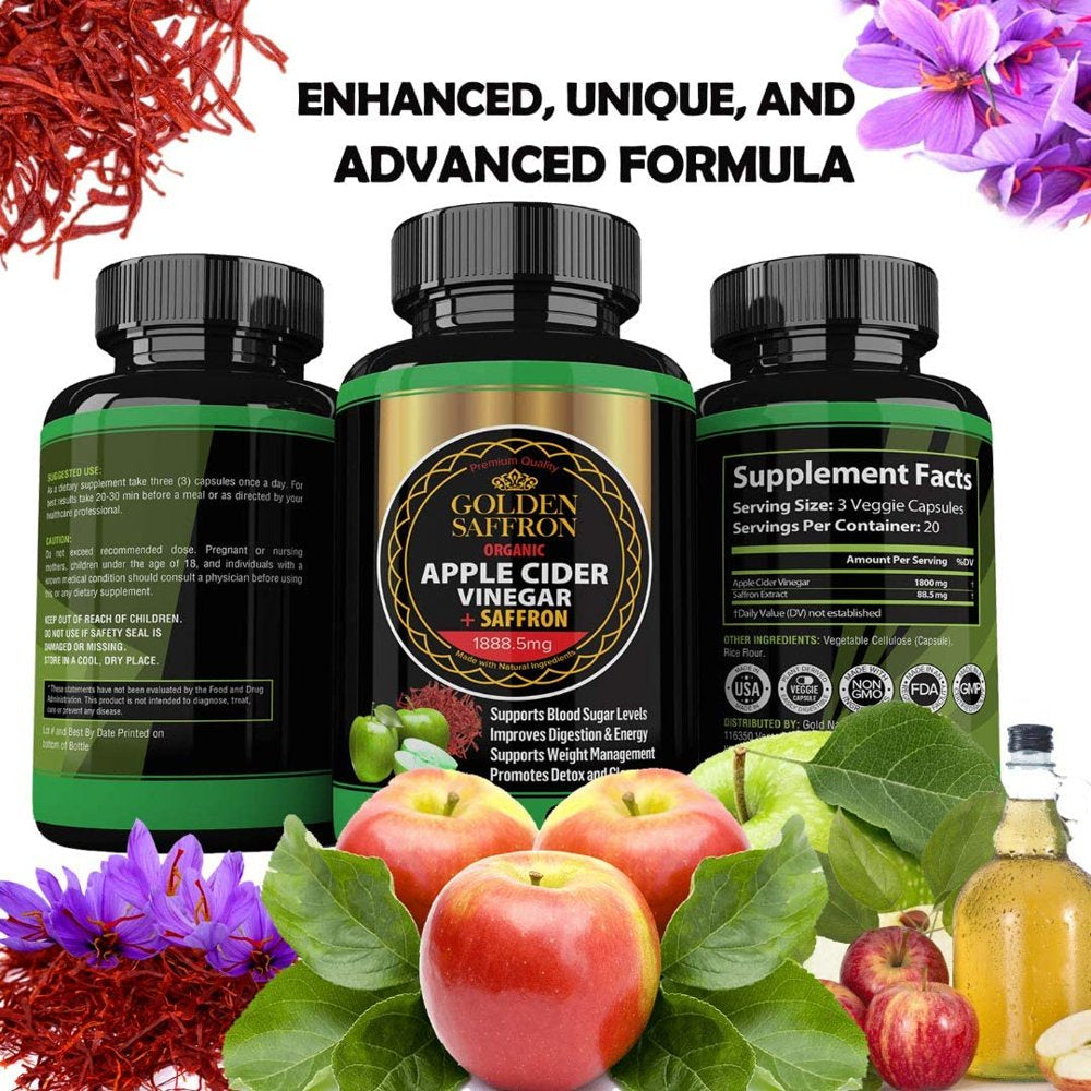 - Rare and Enhanced Formula : For Golden Saffron Apple Cider Vinegar, how well ingredients effect, is the focus. Golden Saffron Apple Cider Vinegar contains 1800mg Organic Apple Cider Vinegar Plus 88.5mg pure Saffron Extract which is the key point in maximizing effectiveness.