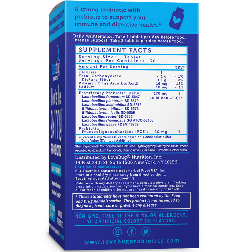 Daily Probiotic Supports Immune + Digestive Health 10 Billion CFU Per Serving‡ Added Prebiotic Dietary Supplement Non-GMO, Free of the 8 Major Allergens, No Preservatives, Artificial Colors or Flavors LoveBug® Probiotics are made using patented BIO-tract® technology. BIO-tract®, protects probiotics from stomach acid and offers controlled release of active ingredients. ‡At time of manufacture.
