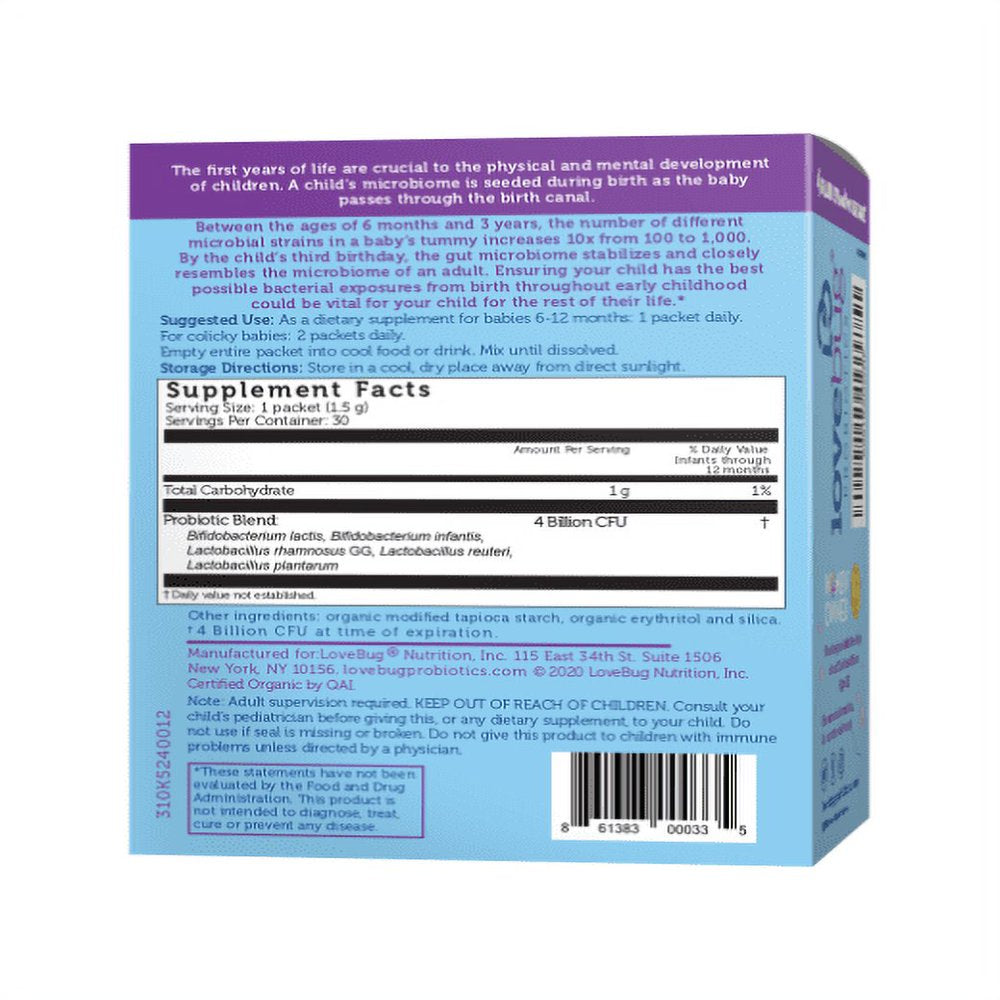 Lovebug Probiotics Award Winning USDA Organic Probiotic for Babies, 6-12 Months, 30 Packets is backordered and will ship as soon as it is back in stock.