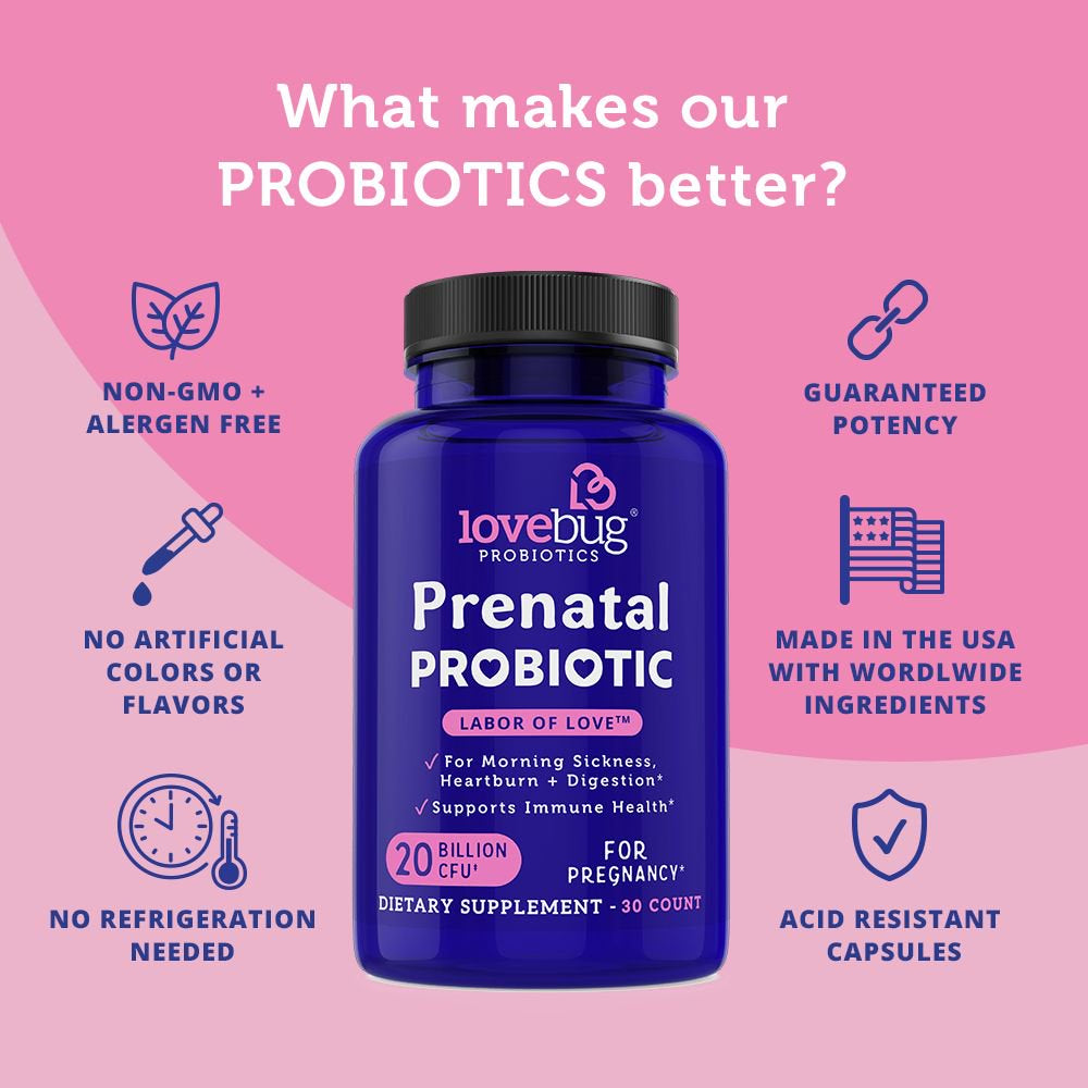 LoveBug Probiotics Prenatal Probiotic Capsules help mitigate morning sickness, heartburn, and supports digestion and immune health For Pregnancy. With 20 billion CFU per serving, it is a safe dietary supplement and healthy probiotic for you and your Baby. Non-GMO, free of the 8 Major Allergens, and no artifical colors or flavors. Shop the entire Lovebug assortment of probiotic supplements on Walmart!