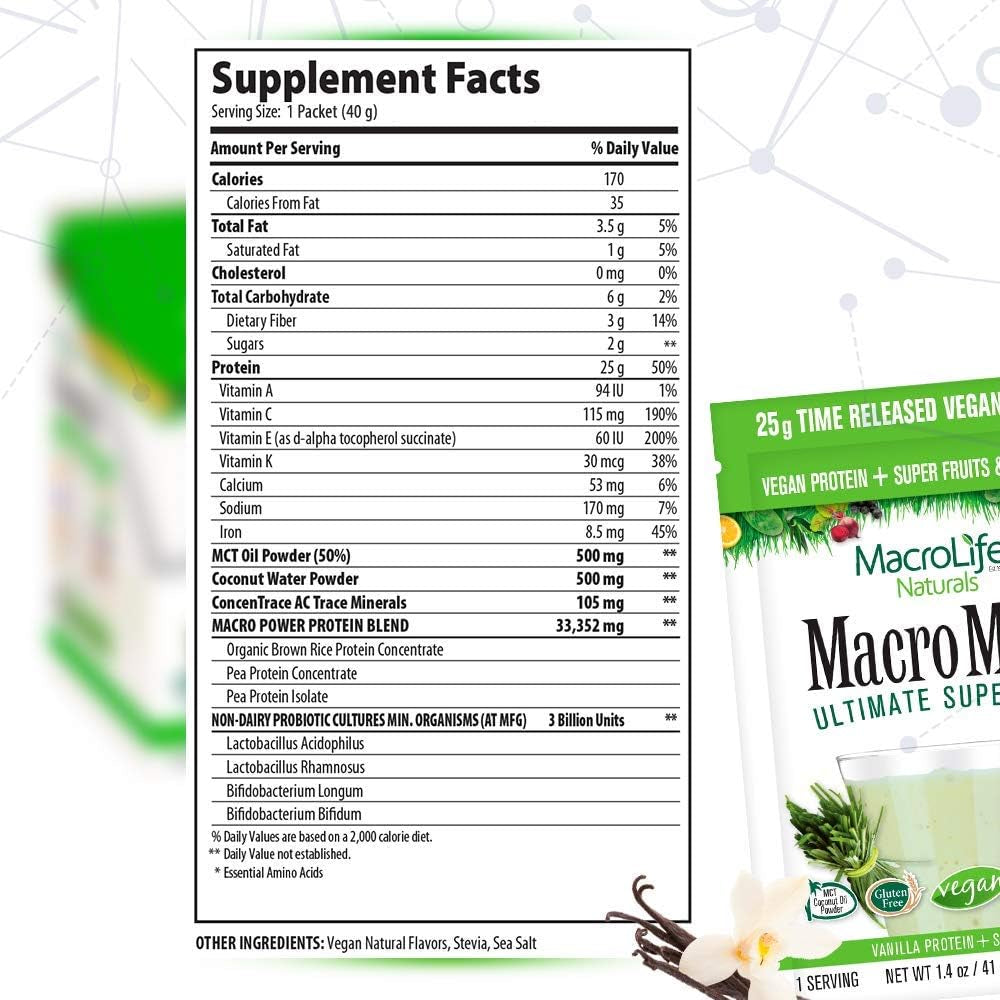Macrolife Naturals Macromeal Vegan Vanilla Superfood Supplement Powder Protein + Greens, Probiotics, Digestive Enzymes, Fiber - Energy, Detox, Immune - Non-Gmo, Gluten-Free- 10 Packet Servings