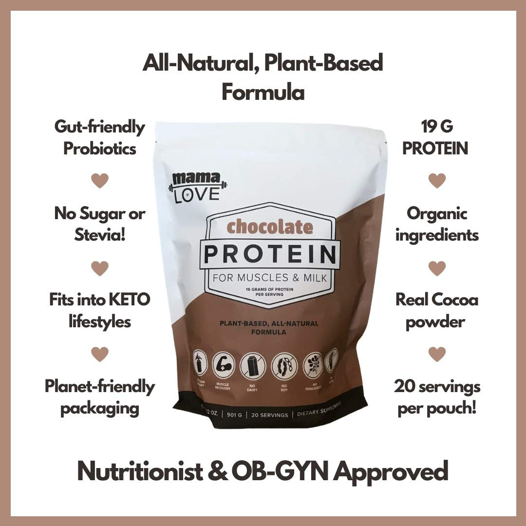 Mama Love Chocolate Protein for Muscles & Milk | Unsweetened | Supports Muscle Recovery & Breast Milk Supply in Moms | Plant Based | Vegan | Organic Ingredients | Probiotics | 20 Servings