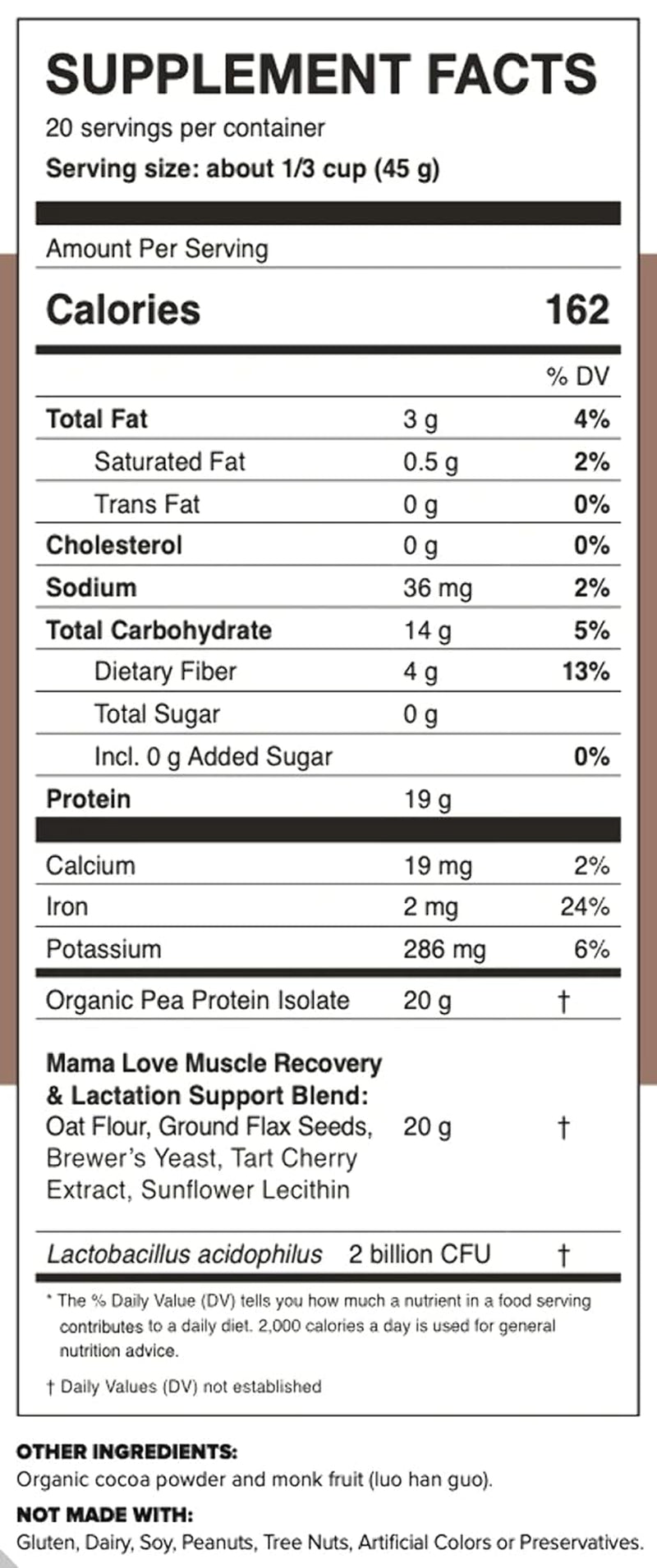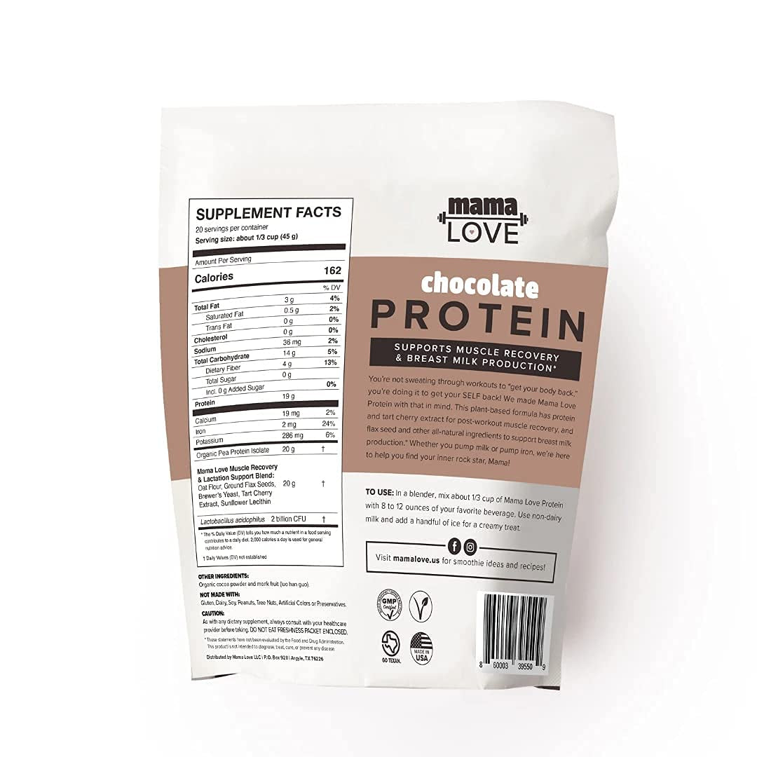 - PERFECT FOR MEALS OR SNACKS: With only 162 calories per serving, Mama Love Chocolate Protein can be mixed in a blender with water for a satisfying protein shake, or made into a lactation supplement smoothie with your favorite non-dairy beverage and fruit