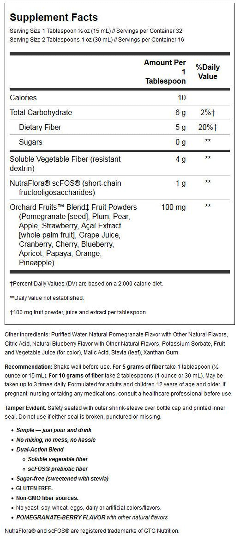 Alive Liquid Fiber Pomegranate-Berry by Nature's Way 16 oz Liquid Alive Liquid Fiber Pomegranate-Berry 16 oz Liquid Fiber Made Easy Simple just pour and drink No mixing no mess no hassle 5 g of fiber per tablespoon Small potent dose Suggested Use As a dietary supplement Shake well before use. For 5 grams of fiber take 1 tablespoon (ounce or 15 mL). For 10 grams of fiber take 2 tablespoons (1 ounce or 30 mL). May be taken up to 3 times daily. Formulated for adults and children 12 years of age and older. If pregnant nursing or taking any medications consult a healthcare professional before use. - Or as directed by your healthcare professional. Supplement Facts Serving Size 1 tablespoon (1 2 ounce or 15 ml) Liquid Amount Per Serving Daily Value Calories 10 Total Carbohydrates 6g 2 Dietary Fiber 5g 3. Sugars 0g Soluble Vegetable Fiber (resistant dextrin) 4g NutraFlora scFOS (short chain fructooligosaccharides) 1g Orchard Fruits Blend Fruit Powders (Pomegranate seed Plum Pear Apple Strawbe