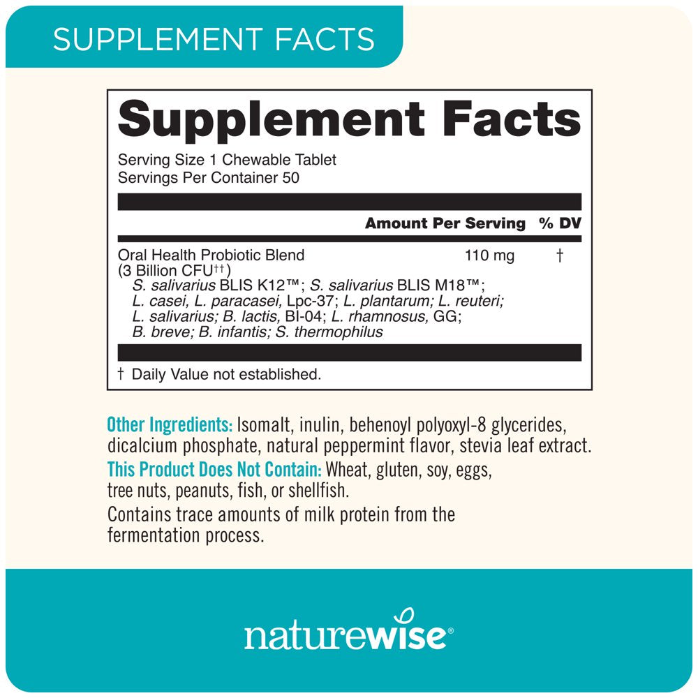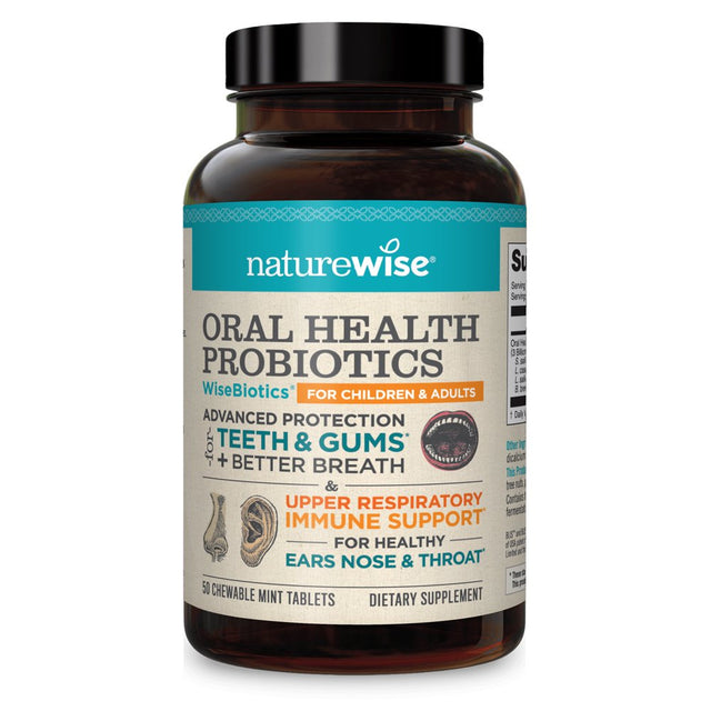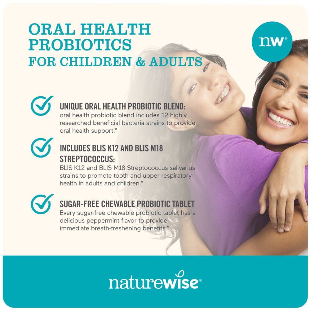 NatureWise Oral Health Probiotics is formulated with 12 clinically researched probiotic strains specifically targeted for oral and upper respiratory health. Our formula includes patented strains BLIS K12™ & BLIS M18™, which are clinically shown to help protect teeth and gums and boost ear, nose and throat immune defenses in both children and adults.* All natural and sugar free, our chewable, mint-flavored probiotics are perfect for the whole family.