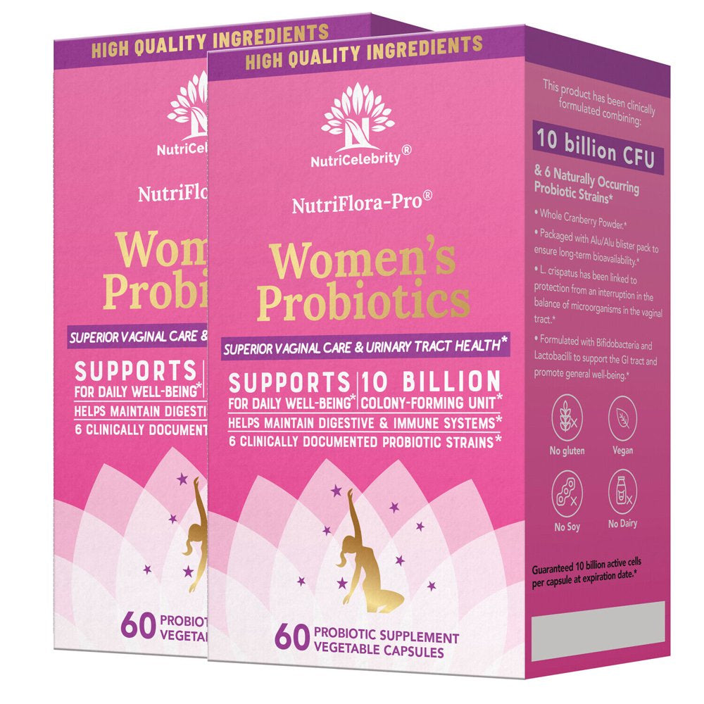 Nutricelebrity Nutriflora-Pro Probiotics for Women - Support Vaginal, Urinary Health (UTI), Digestive System, Period Pain, Yeast, and BV Relief, Cranberry Pills, 10 Billion CFU 6 Strains 60 Cap 2 Pack