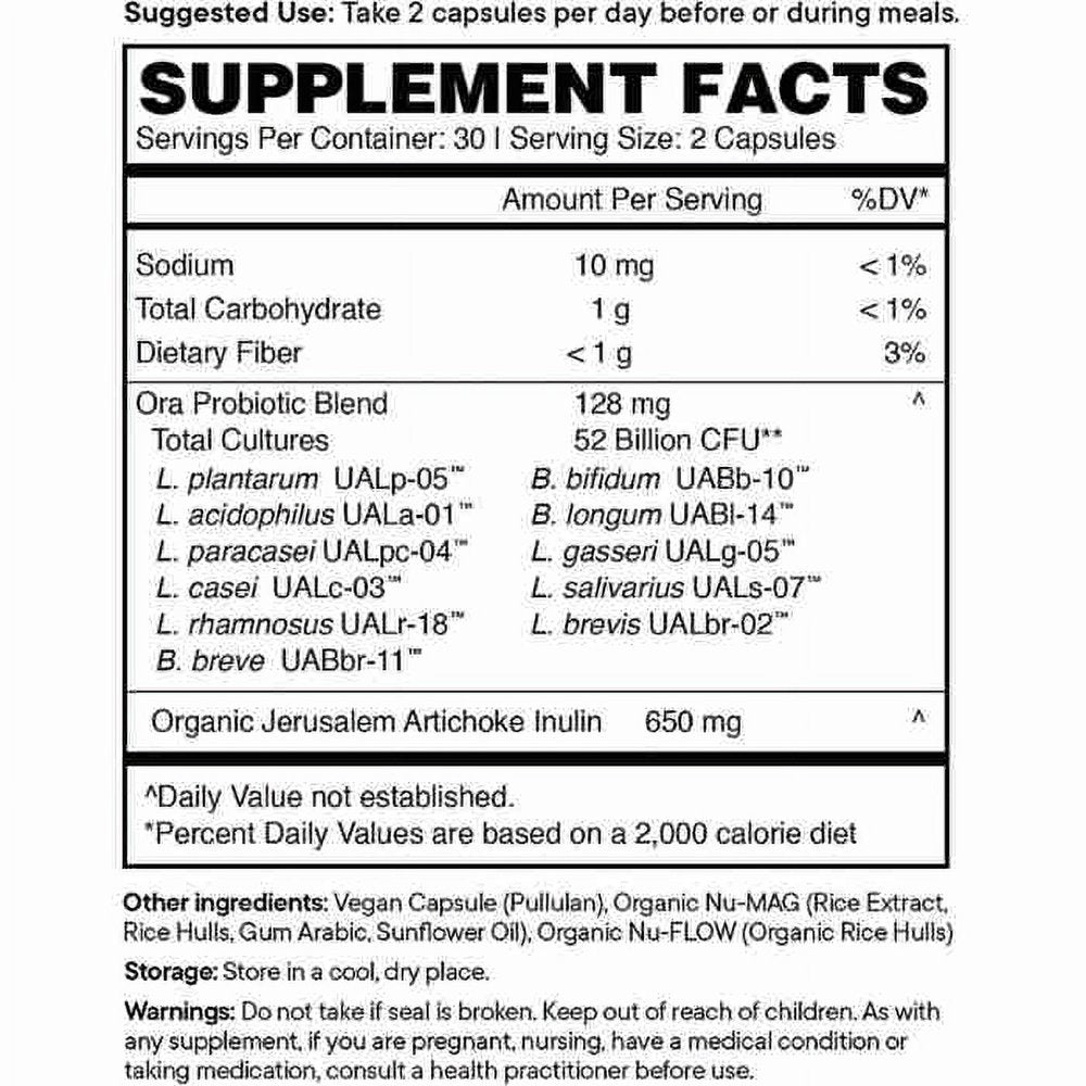 Trust Your Gut: Probiotics + Prebiotics Capsules: Lactobacillus acidophilus DDS-1, Lactobacillus reuteri, Bifidobacterium bifidum, Bifidobacterium breve, Bifidobacterium lactis, Bifidobacterium longum, Organic Jerusalem Artichoke Inulin, Vegan Capsule (Pullulan), Organic Rice Extract Blend. Trust Your Gut: High Potency Probiotic + Prebiotic Capsules: Ora Probiotic Blend: Lactobacillus acidophilus, Lactobacillus reuteri, Bifidobacterium bifidum, Bifidobacterium breve, Bifidobacterium lactis, Bifidobacterium longum, Organic Jerusalem Artichoke Prebiotic, Vegan Capsule (Pullulan), Organic Nu-MAG (Rice Extract, Rice Hulls, Gum Arabic, Sunflower Oil), Organic Nu-FLOW (Organic Rice Hulls). How should I take these Trust Your Gut Probiotic + Prebiotic Capsules?Two of these capsules should be taken daily. They can be taken at any time of day, but it is recommended to take both capsules together before, or with a meal. To get the best results, it is also great to try and be consistent and take the capsules at the same time every day. You can swallow the capsules down with water, or, if you don’t like swallowing pills, feel free to twist open the capsule and mix the powder with food or drink to make it easier to swallow! Whatever works for you, just make sure to get the powder down quickly, so the Probiotics can start working their magic!- High Potency Dose of Science-backed Strains: Meet the high potency version of Ora’s best-selling probiotic Trust Your Gut with 52 Billion probiotics per serving. The probiotic strains in this product have been studied for their potential to support digestive health, immune health, mood, healthy weight management, and a strong intestinal wall.