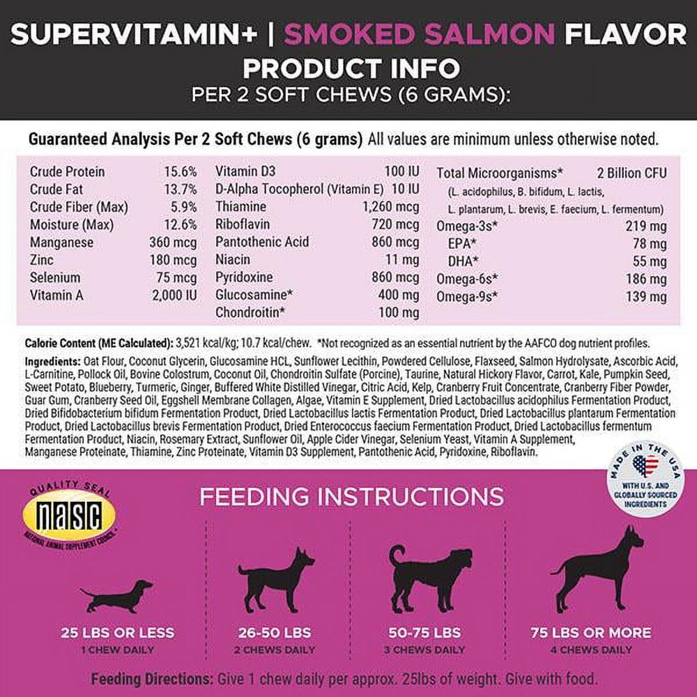 - BUILT ON OUR EXCLUSIVE NATURAL PURE VITALITY BLENDTM: Multivitamin Max Strength is formulated with our Pure Vitality BlendTM, made with natural ingredients you can find in your own pantry. We combine this nutritious blend with powerful, research-backed active ingredients tobest support your dog’s health & vitality. These premium, all-in-one soft chews contain essential nutrients to support 15 areas & help keep them in peak condition. Plus, your dog will love the delicious smoked salmon flavor!