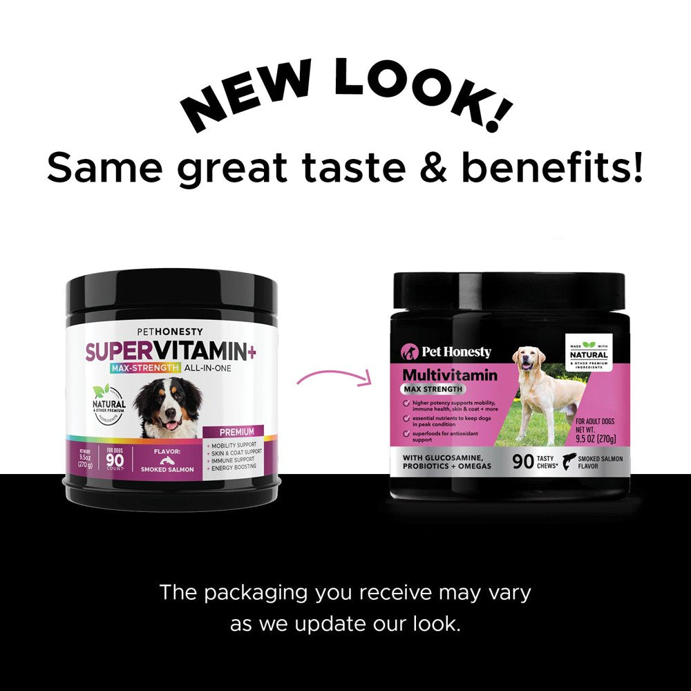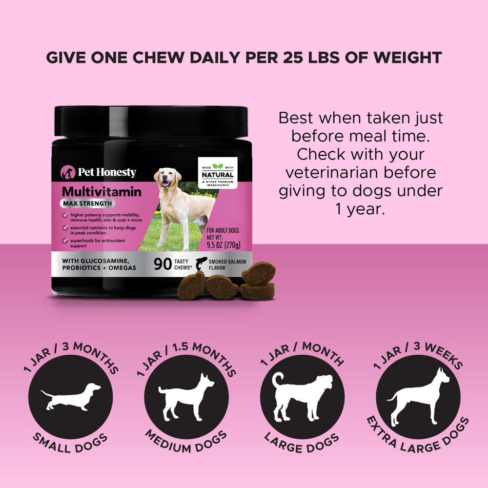 Pet Honesty Dog, Max Strength 10 in 1 Multivitamin Supplement W Glucosamine Probiotics and Omegas, Smoked Salmon Flavor, 90 Count Soft Chews - Max Strength Salmon / 90 / Adult is backordered and will ship as soon as it is back in stock.