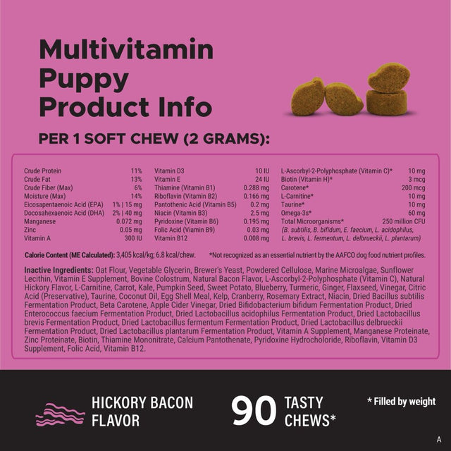 Pet Honesty Puppy, Multivitamin Supplement for Puppies W DHA and Probiotics, Hickory Bacon Flavor, 90 Count Soft Chews - Bacon / 90 / Puppy is backordered and will ship as soon as it is back in stock.