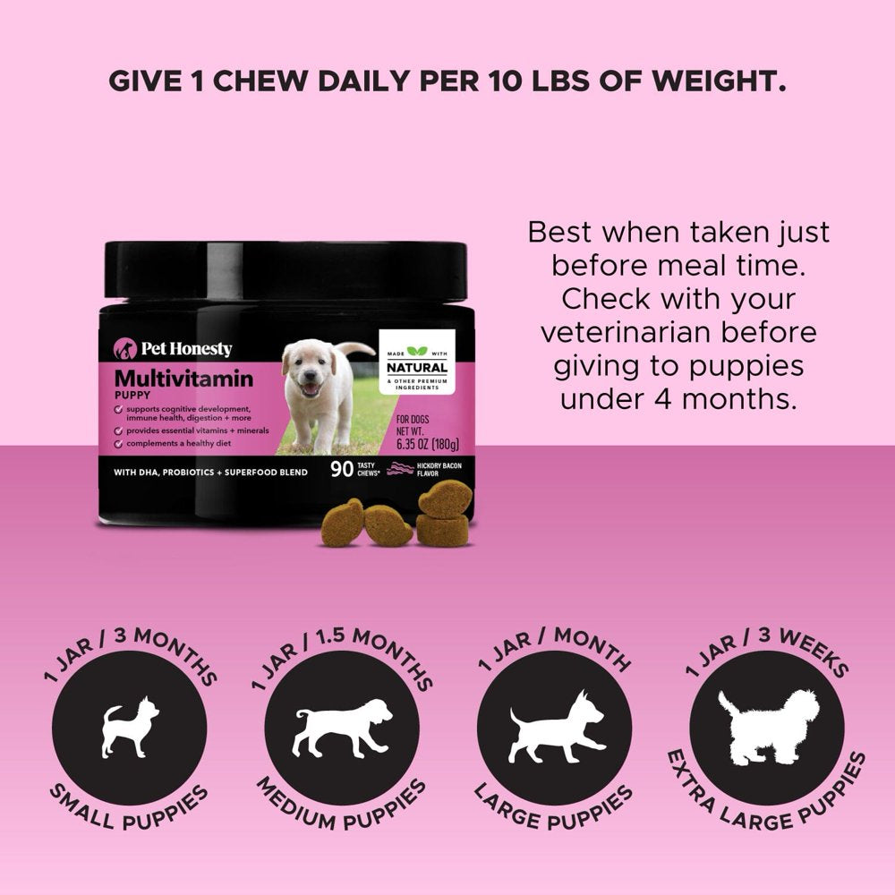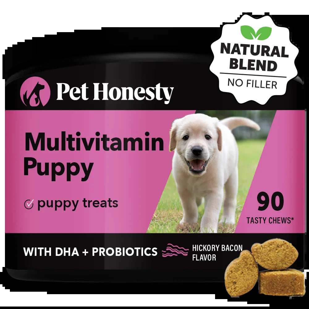 - CREATED TO TARGET IMPORTANT AREAS IN YOUR PUPPY’S GROWTH: Pet Honesty’s Multivitamin Puppy soft chews are formulated to give your puppy the essential nutrients they need between 4-12 months of age. Learning how to be a part of the pack requires a sharp and focused brain. Socialization is important during the early months, so a strong immune system is crucial to keep your puppy healthy while they play. As we all know, puppies explore the world with their mouths, so it's necessary to support their tummies and overall digestive health. With a delicious Hickory Bacon flavor your puppy will love, getting them started on their health routine is easy! They’ll be ready for a simple transition to our Multivitamin 10-in-1 once they reach 1 year of age.