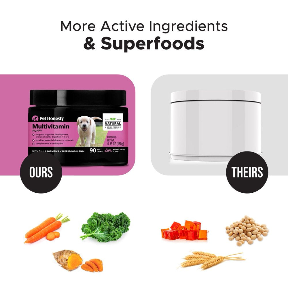 - MADE WITH NATURAL & OTHER PREMIUM INGREDIENTS LIKE DHA, BETA-CAROTENE, AND PROBIOTICS: Pet Honesty’s Multivitamin Puppy is filled with health-supporting ingredients you can trust. DHA is an omega-3 fatty acid from fish oil, kelp, and algae that supports brain health and development. Beta-Carotene is an antioxidant found in carrots that supports immune system health and eye health. Probiotics help support overall gut health, immune system function, and proper bowel function.
