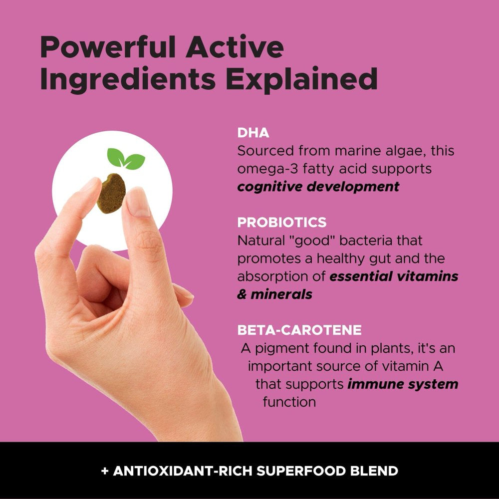 - Made with natural and other premium ingredients including DHA, Beta-Carotene, and Probiotics