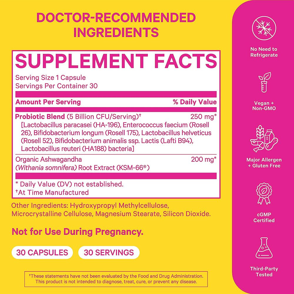 Lactobacillus Paracasei (HA-196), Enteroccus faecium (Rosell 26), Bifidobacterium longum (Rosell 175), Lactobacillus helveticus (Rosell 52), Bifidobacterium animalis ssp. Lactis (Lafti B94), Lactobacillus reuteri (HA188) bacteria, Organic Ashwagandha root extract, Hydroxypropyl Methylcellulose, Microcrystalline Cellulose, Magnesium Stearate, Silicon Dioxide (Vegetarian Capsule)/div>
