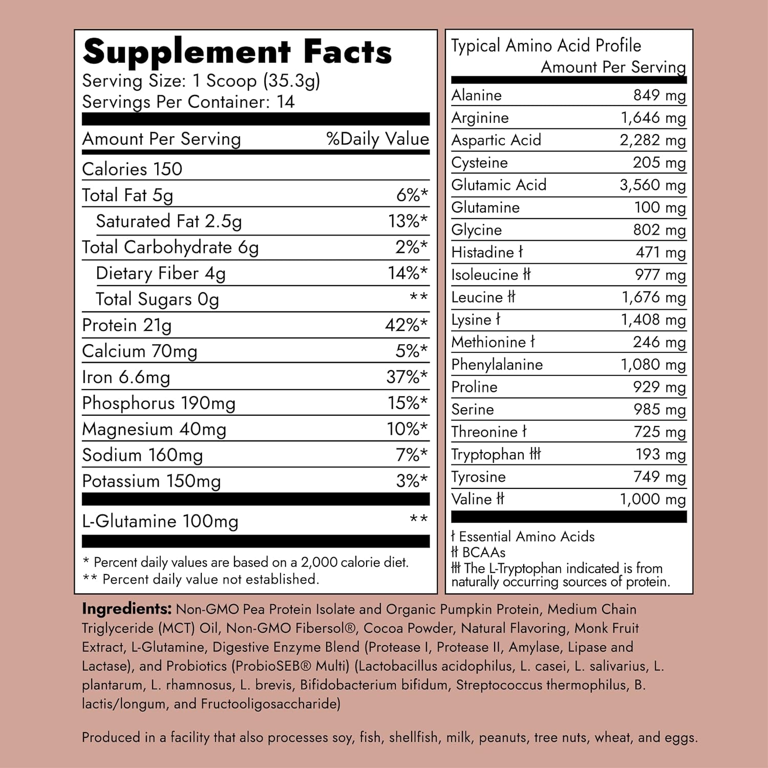 - FORMULA HIGHLIGHTS – Pea and Pumpkin protein blend provides complete amino acid profile, high in iron. Easily digested with added Probiotics and 100mg of L-Glutamine. Sweetened with Monk Fruit.