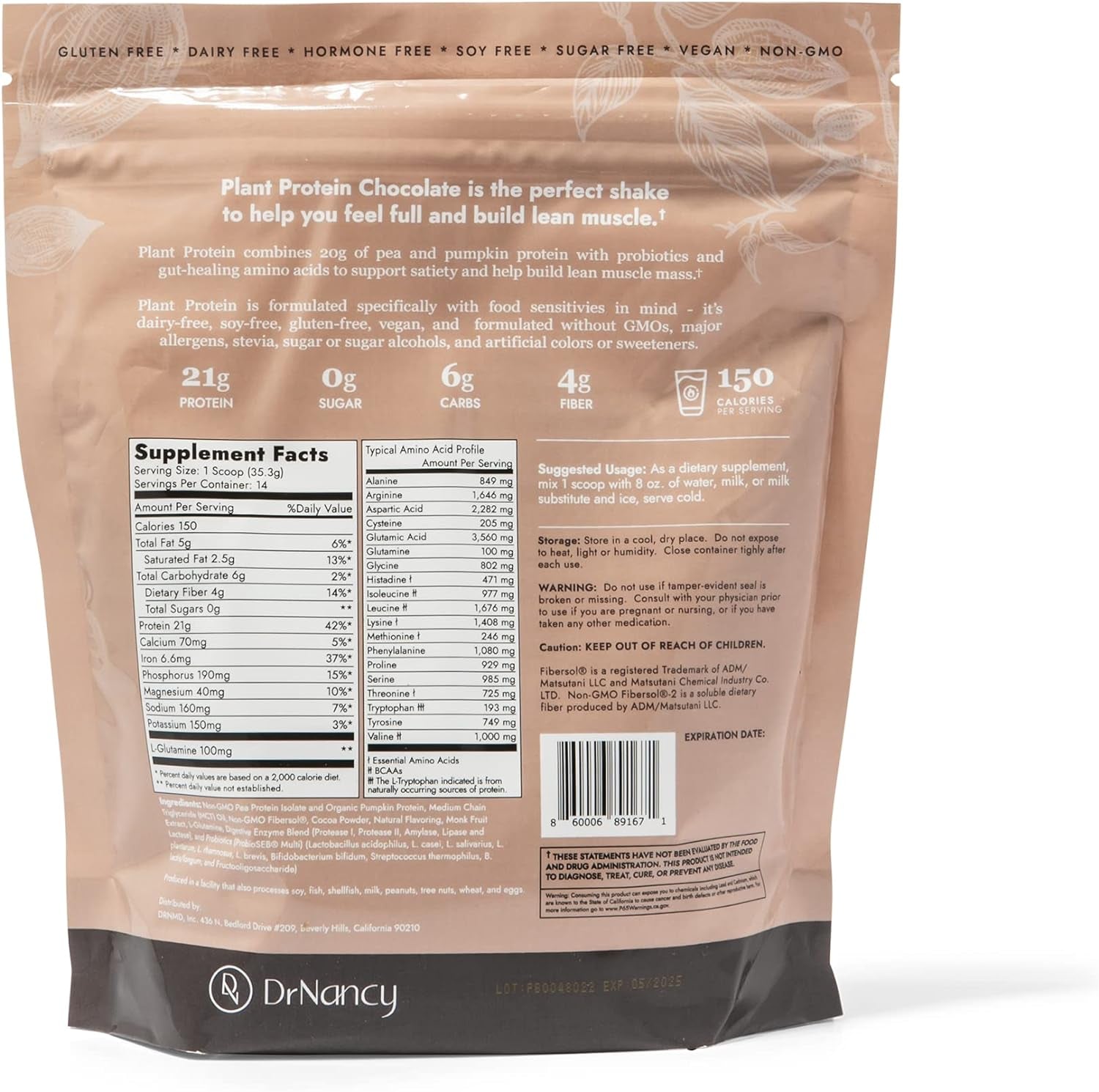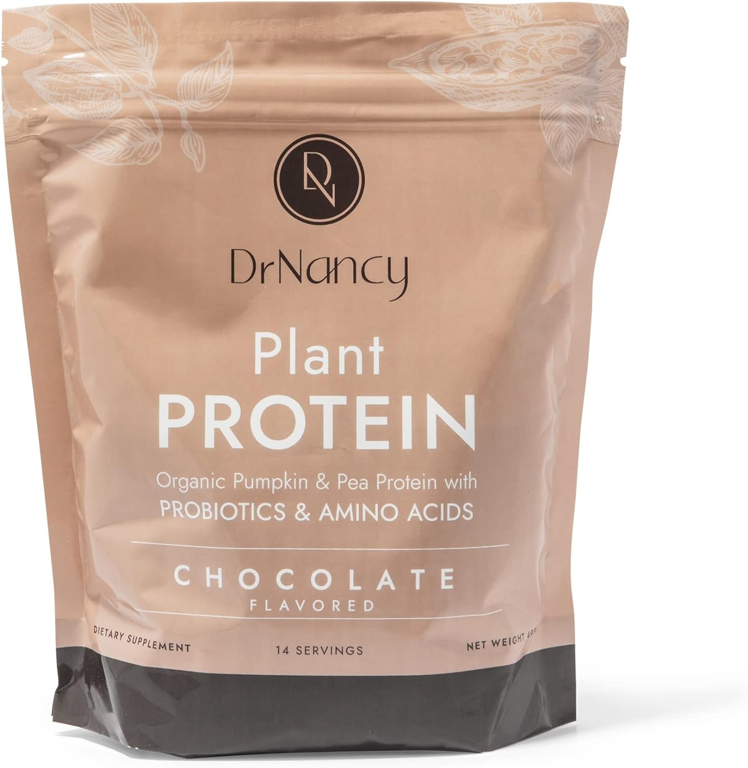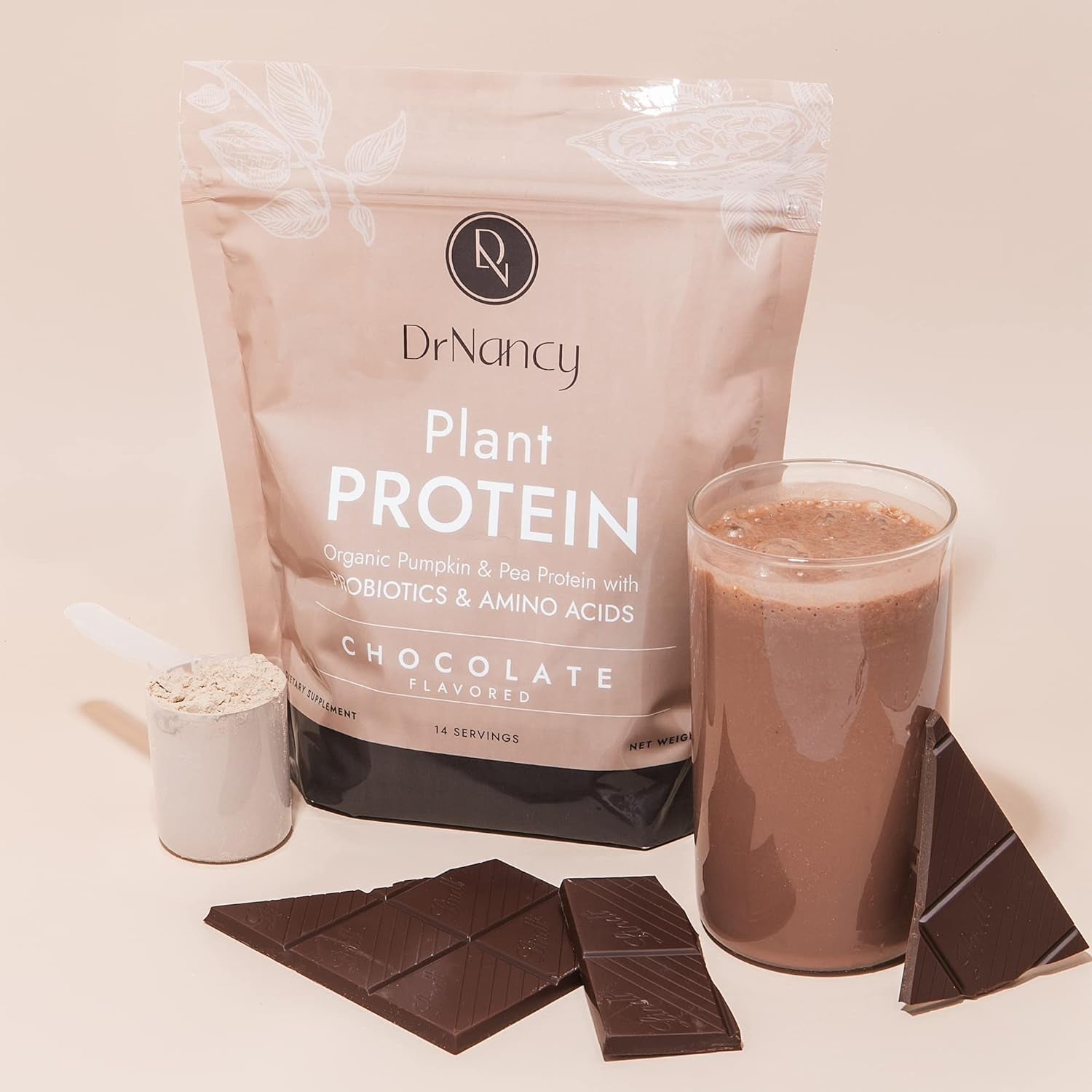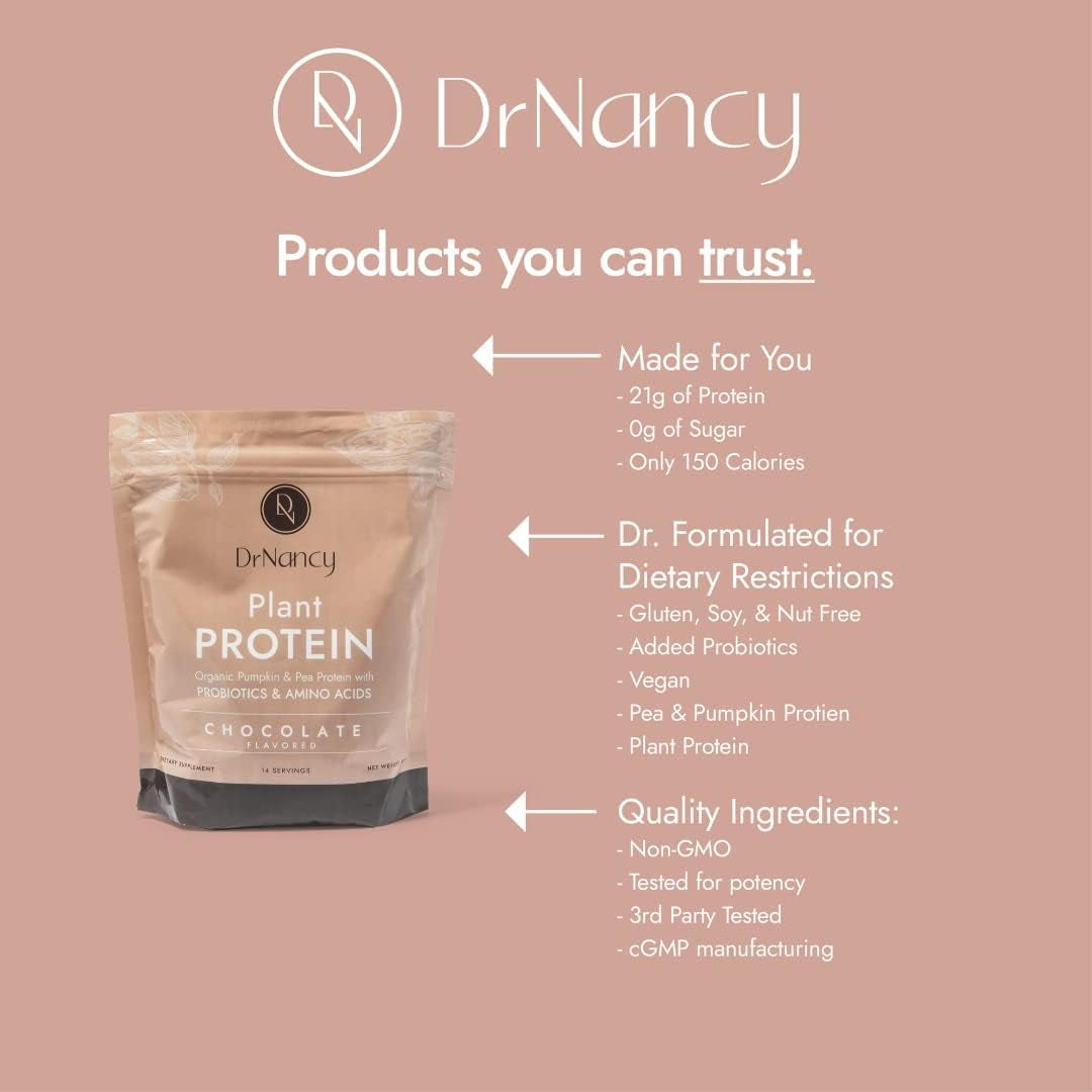 Plant Protein Chocolate by Dr. Nancy MD (14 Servings, 35.3G), 21G Pea and Pumpkin Protein, with Added L-Glutamine & Probiotics