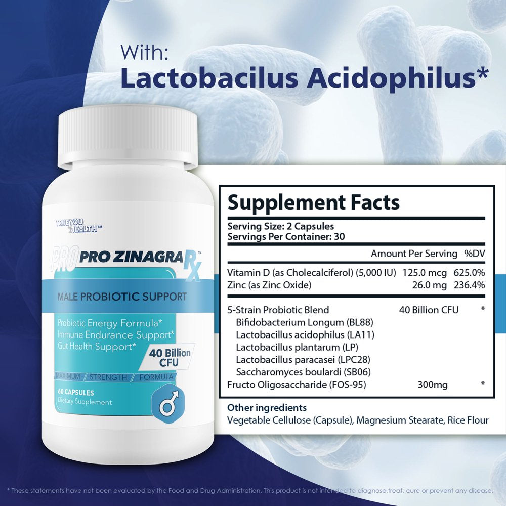 Pro Zinagra RX - Male Probiotic Support - Promote Increased Energy & Endurance - Support Gut & Male Health with Probiotics for Men - 40 Billion CFU Male Formula - Additional Immune Support Benefits