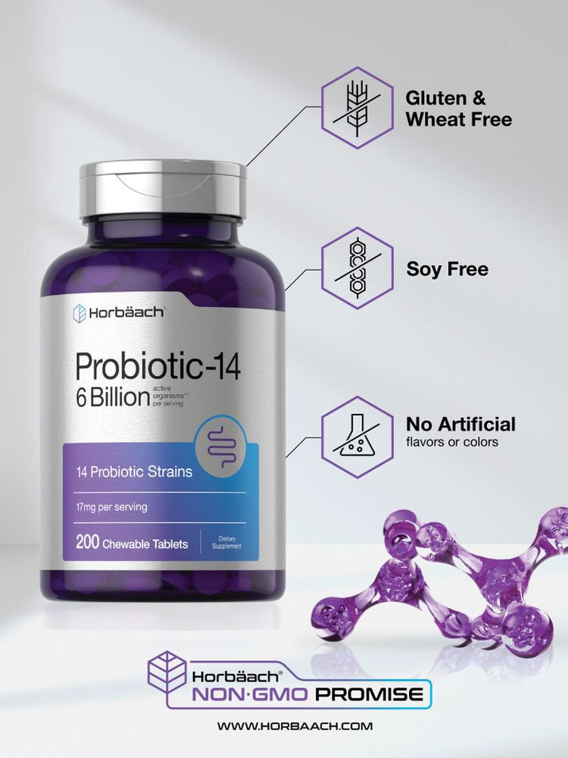 **Horbäach® Chewable Probiotic-14 contains over 6 billion active organisms per serving (including the naturally occurring metabolic products produced by Lactobacilli) at the time of manufacture.