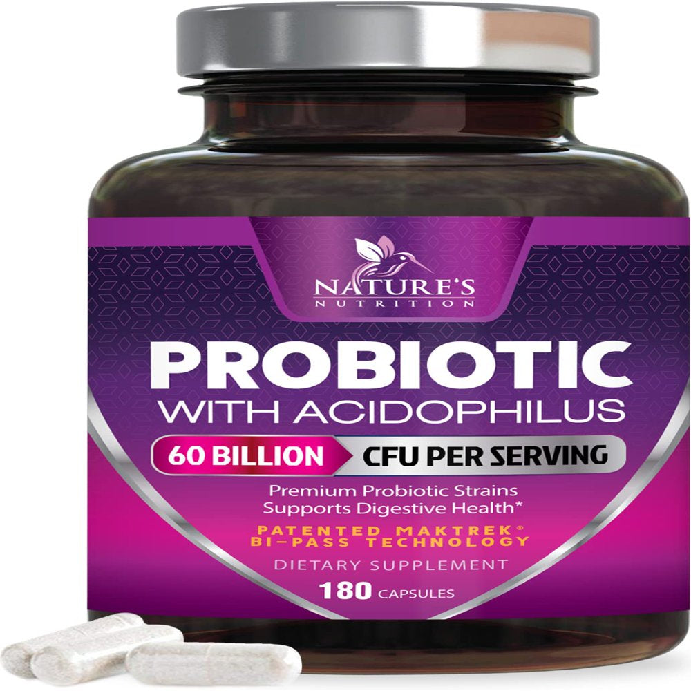 Probiotics, 60 Billion CFU per Serving, Probiotic with Prebiotics for Digestive & Immune Health Support for Women & Men - Nature'S Supplement Is Shelf Stable, Soy, Dairy & Gluten Free - 180 Capsules