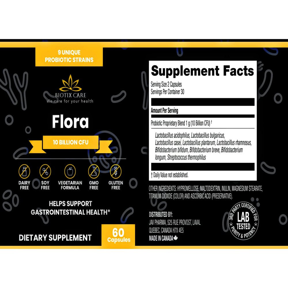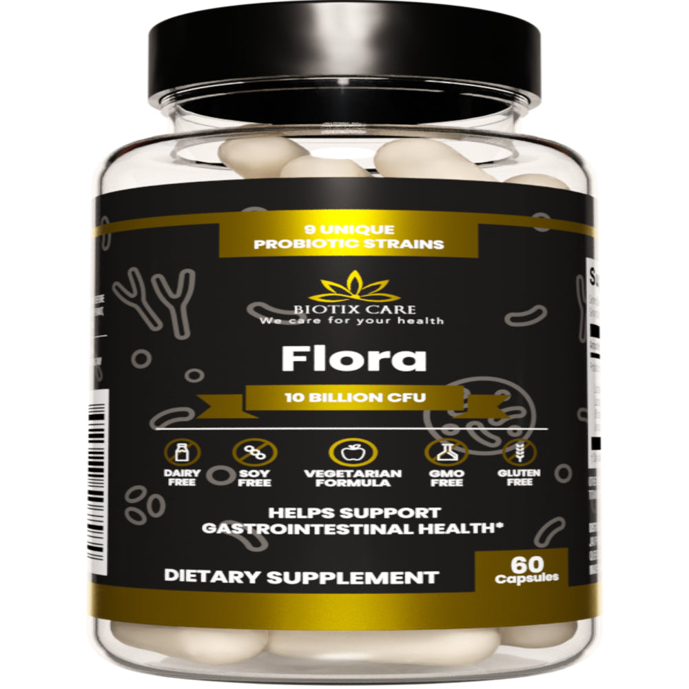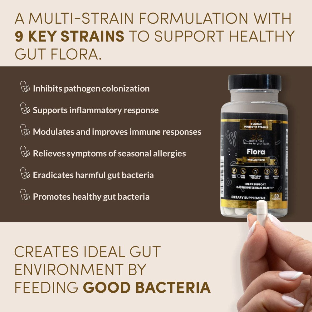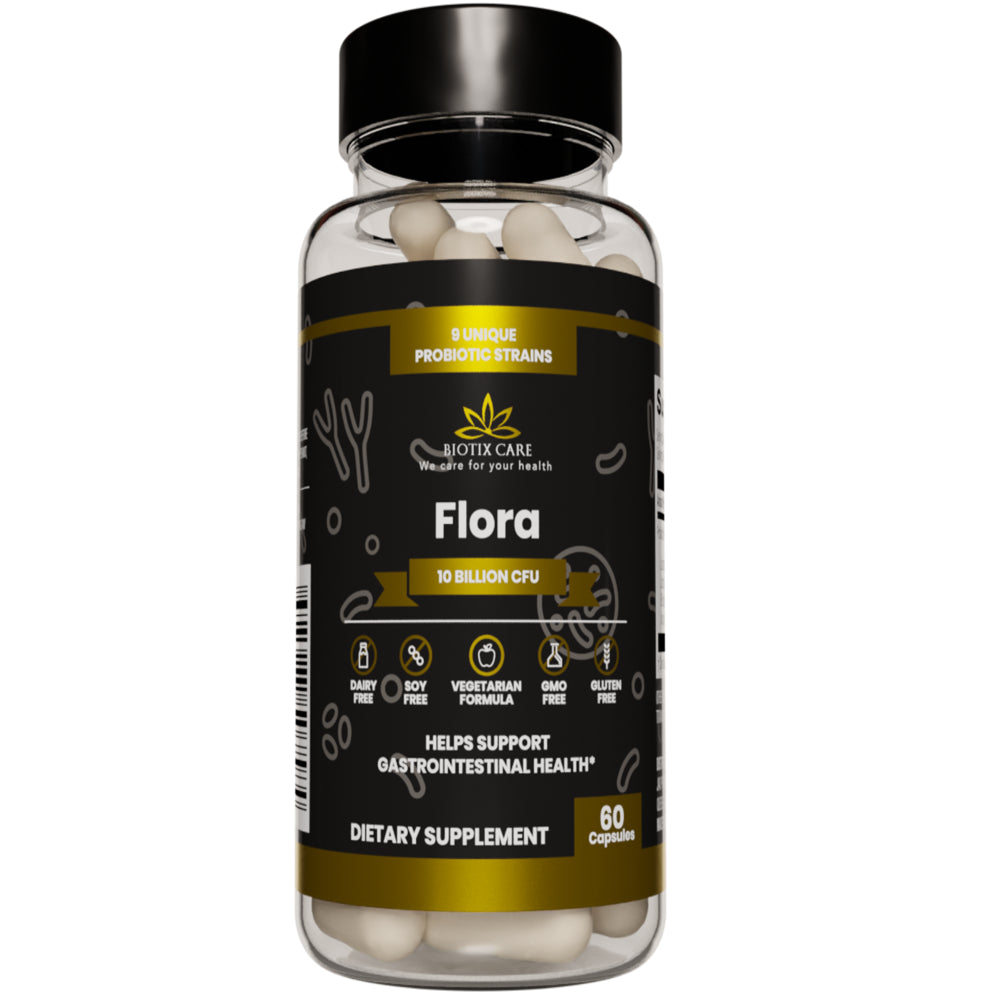 - Flora is a 9 unique probiotic strain combined with 10 billion CFUs per capsule, which provide viable cells for proliferation in the intestinal tract.