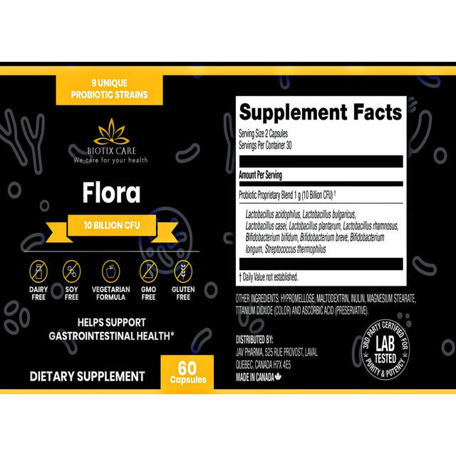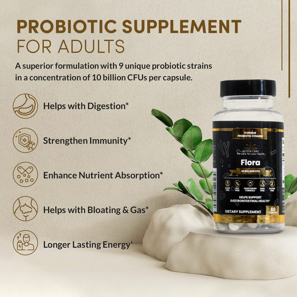 - WHEN IT COMES TO YOUR DAILY PROBIOTIC, you need one that will truly improve your GUT HEALTH and DIGESTION – but many probiotics for men & women don’t seem to deliver any results. Biotix Care Flora is formulated with the 9 MOST CLINICALLY STUDIED strains found in the 2 most important probiotic groups: BIFIDOBACTERIUM for the colon, and LACTOBACILLUS for the small intestine. The result? Complete coverage of the intestinal tract, for TRULY EFFECTIVE gut and digestion support.
