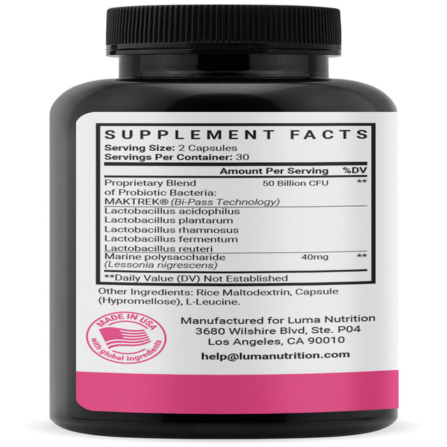 Premium Probiotic for Women - Specially formulated for feminine health and total digestive health. Our formular contains 50 Billion CFU of high quality probiotics, and also includes powerful prebiotics. Feminine Health - Our probiotic formulation contains Lactobacillus rhamnosus and Lactobacillus reuteri strains, which can help boost vaginal health and maintain pH balance. Trusted Brand - If you’re not completely satisfied with your purchase of our probiotic formulation, we offer a full refund or a replacement product. Simply send us a message and we will make it right. 30 Day Supply - Each bottle last for one month. Luma Nutrition always provides top value with only the highest quality ingredients. Our probiotic formulation premium quality. Made in the USA - All Luma Nutrition supplements are manufactured in GMP certified facilities in the United States. We are veteran owned and operated and are here to help answer any questions you have.
