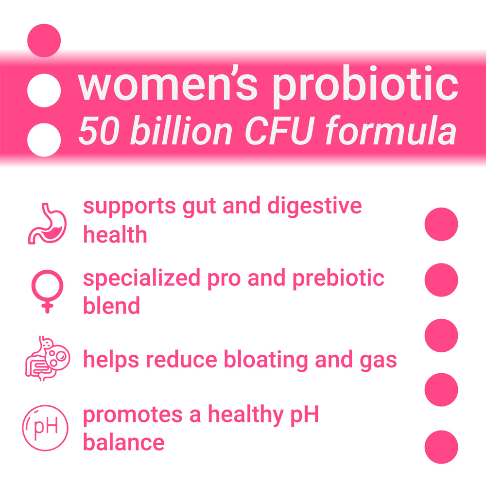 Premium Probiotic for Women - Specially formulated for feminine health and total digestive health. Our formular contains 50 Billion CFU of high quality probiotics, and also includes powerful prebiotics. Feminine Health - Our probiotic formulation contains Lactobacillus rhamnosus and Lactobacillus re