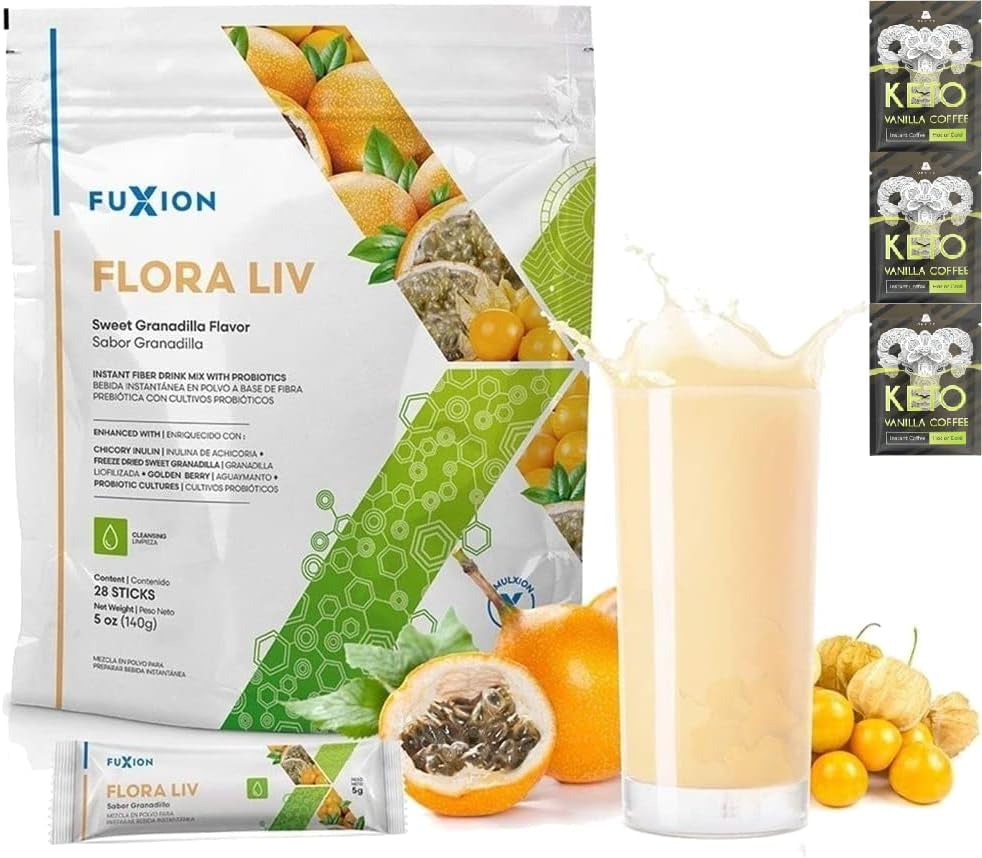 FuXion Flora Liv is a a delicious passion fruit beverage with more than 10 billion probiotic bacteria delivered live to the gut to promote digestive health and activate your body's natural defenses from the intestinal flora. Benefits Flora Liv contains 10 billion probiotic bacteria that help reconstitute and maintain the balance of the intestinal flora. This reinforces the body's natural defenses and maintains intestinal health. It will regenerate and balance your intestinal flora, necessary for the proper assimilation of nutrients, as well as the body's immunological protection.