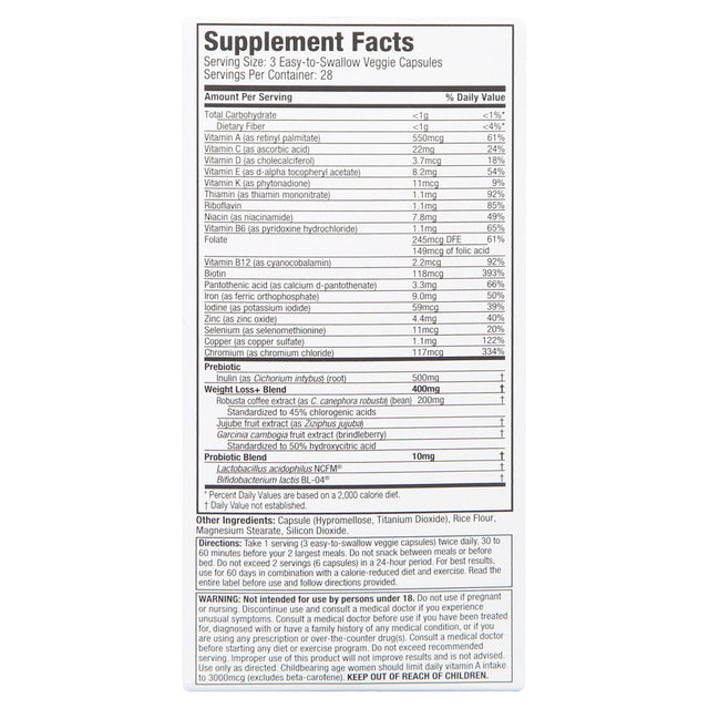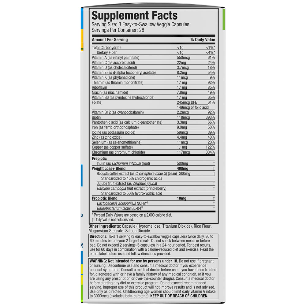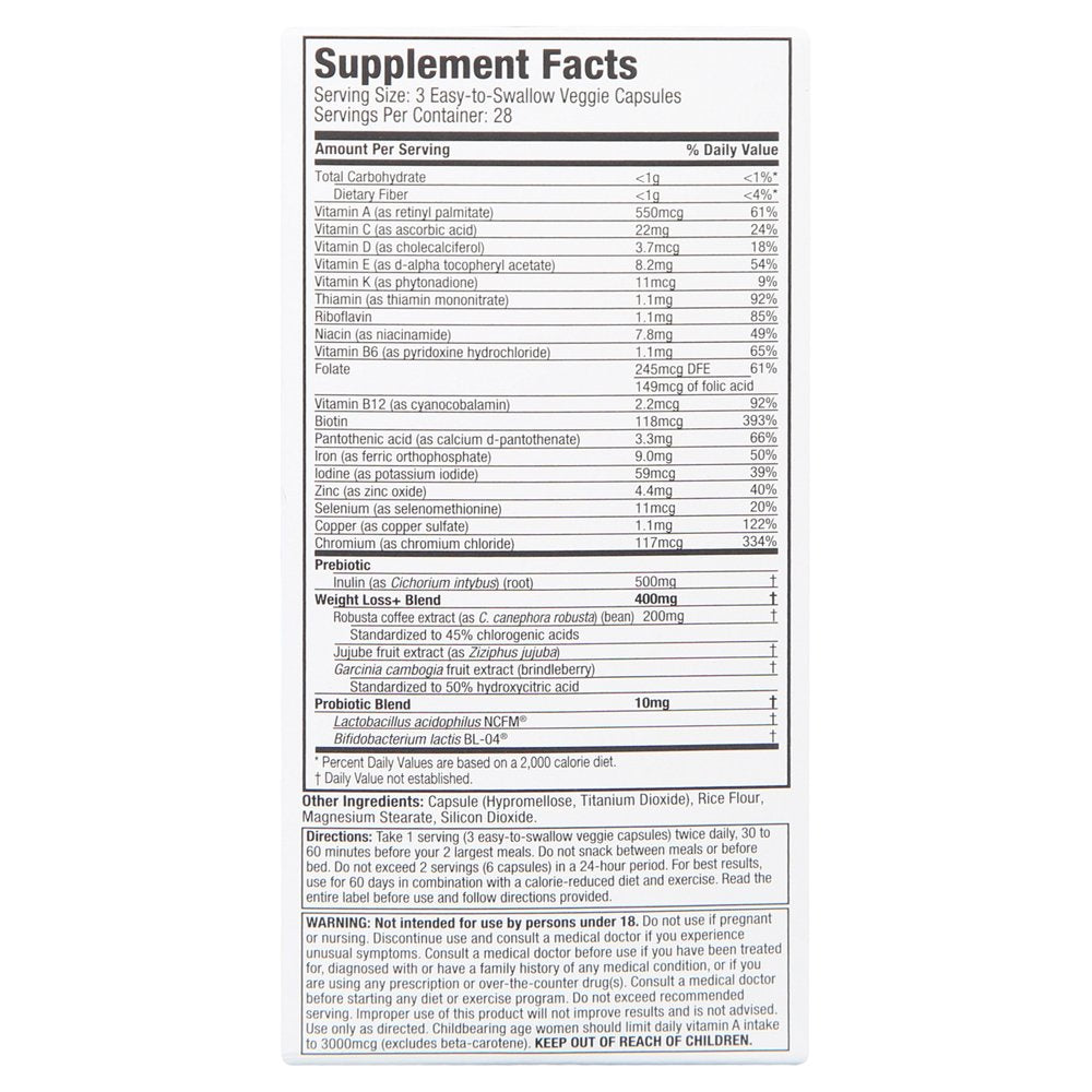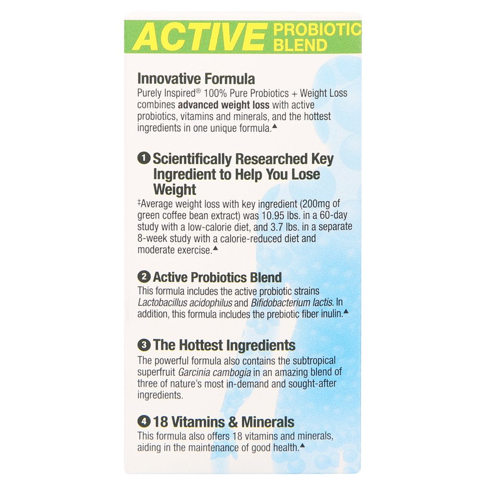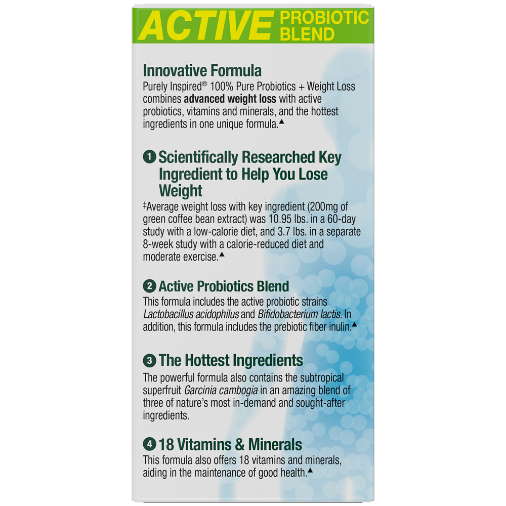 When you’re juggling family and work, who has time to take multiple supplements? Support your weight loss goals with Purely Inspired 100% Pure Probiotics + Weight Loss as part of your diet and exercise plan. Our formula features veggie capsules with green coffee extract to help you lose weight. We’ve even put in 19 vitamins and minerals to make the most out of this tiny tablet. Make this one-stop-shop formula work for you while you put work into your day. 100% Pure Probiotics plus Weight Loss includes the active probiotic strains Lactobacillus acidophilus and Bifidobacterium lactis. In addition, this formula includes the prebiotic fiber inulin. For Males and Females.