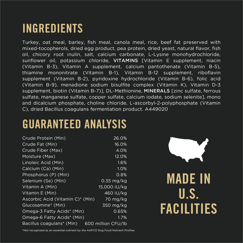 Provide healthy nourishment for your dog with Purina Pro Plan SPECIALIZED Sensitive Skin & Stomach Turkey & Oat Meal Formula adult dry dog food. Real turkey is the #1 ingredient in this wholesome, high protein dog food, and real oat meal is easy to digest and gentle on his sensitive stomach. Sunflower oil provides a rich source of omega-6 fatty acids to support his skin and coat, and omega-3 fatty acids from fish oil and glucosamine promote mobility and joint health for dogs. Our pet nutritionists fortify our sensitive stomach dog food with guaranteed live dog probiotics to support healthy digestion and include natural prebiotic fiber to promote beneficial intestinal bacteria. Highly digestible for optimal nutrient delivery and with no corn, wheat, soy, or artificial colors or flavors, our dry dog food for skin and coat care helps your pal get the maximum benefits from every serving. Plus, antioxidants in this dog food kibble help support a healthy immune system.