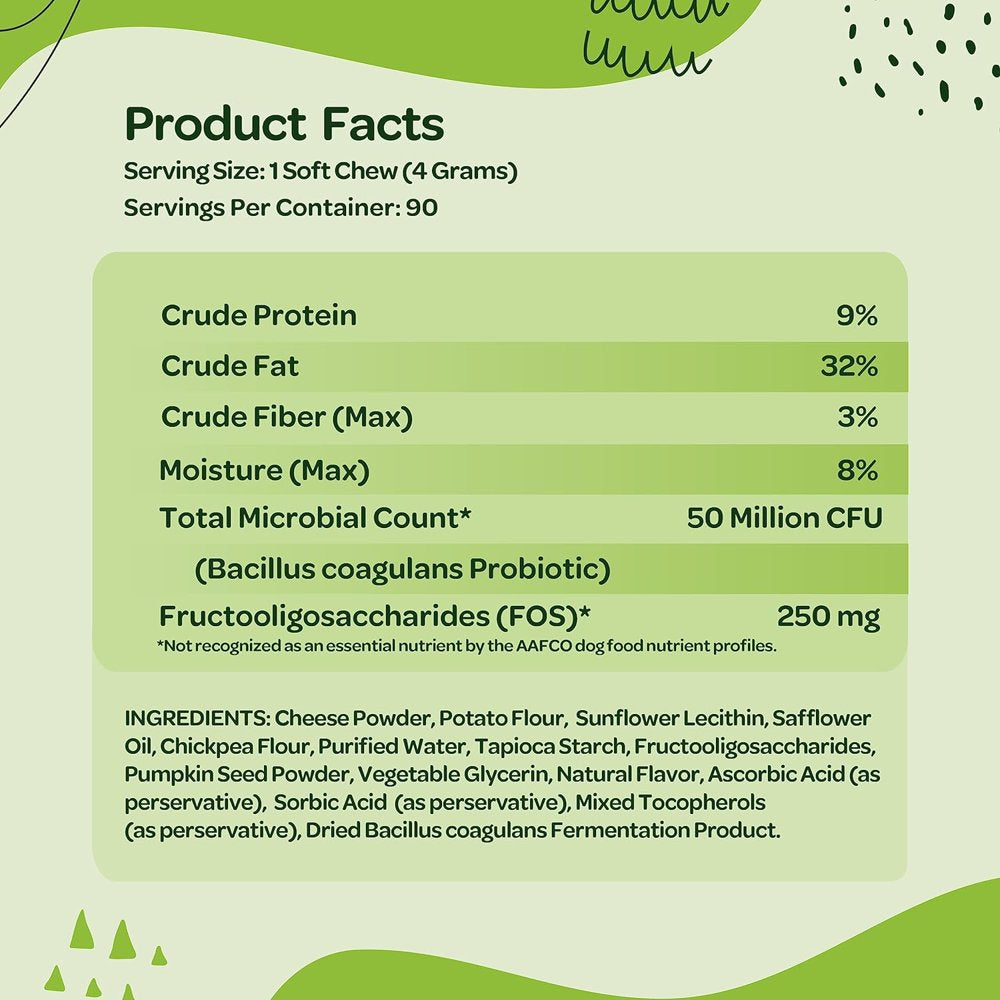 These probiotics for dogs gives digestive support that promotes gas relief and eliminates bloating, constipation, and upset stomach. These healthy dog treats feature 500 million CFU Bacillus Coagulans, prebiotics, and pumpkin for ultimate digestive comfort and immune support.