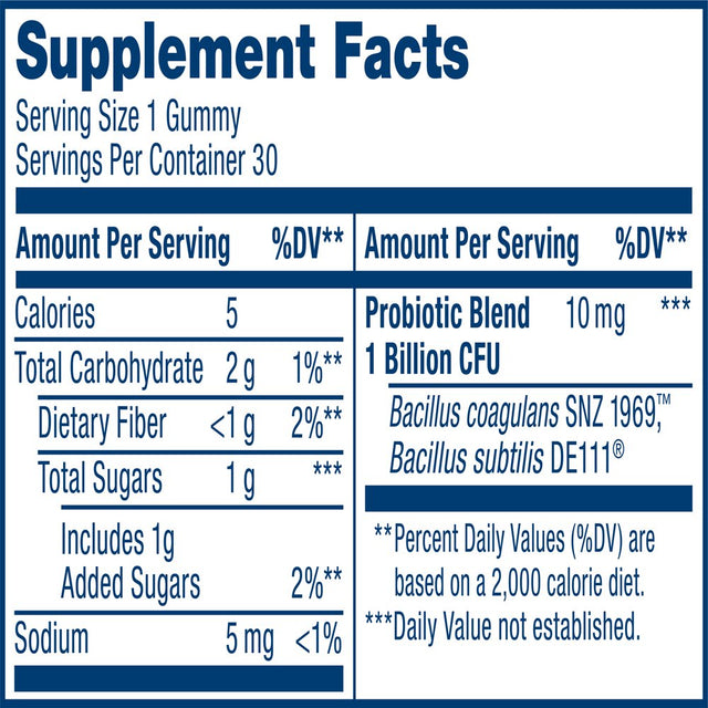 Serving Size 1 Gummy. Servings Per Container 30. Calories 5; Total Carbohydrate 2 g; Dietary Fiber <1 g; Total Sugars 1 g (Includes 1 g Added Sugars); Sodium 5 mg; Probiotic Blend (1 Billion CFU) 10 mg [Bacillus Coagulans SNZ 1969™, Bacillus Subtilis DE111®]. Other ingredients : Inulin (from chicory root), sugar, pectin, natural fl¬avors, citric acid, sodium citrate, color (black carrot juice concentrate), organic sunfl¬ower oil with carnauba wax, corn starch. DE111® is a trademark of Deerland Probiotics & Enzymes, Inc. See product label for detailed list of ingredients./div>
