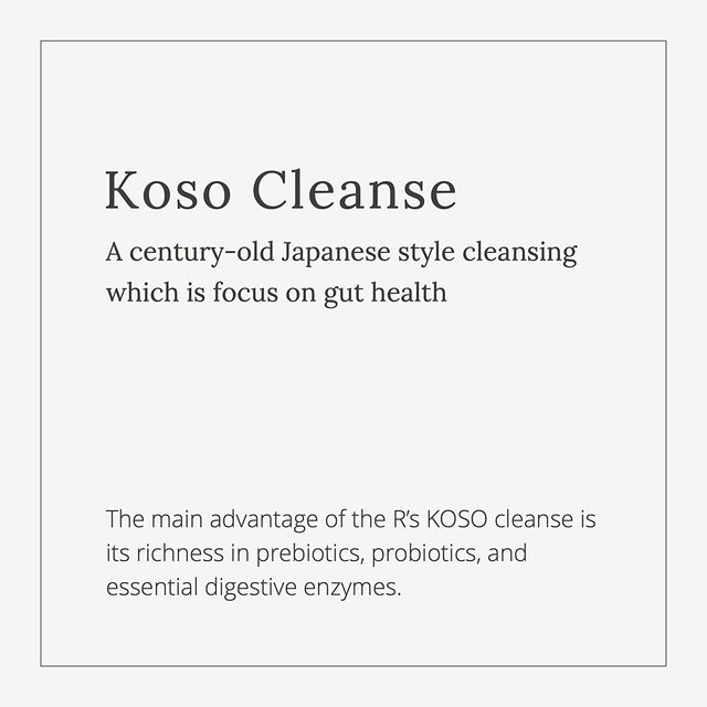 - KOSO CLEANSE&DETOX:It's a century-old traditional Japanese juice cleansing method that has proven to keep your gut healthy. Cleansing with R'S KOSO is a great way to reset your digestive system, and restoring microbiome health. The main advantage of the R's KOSO cleanse is its richness in prebiotics, probiotics, and digestive enzymes. We guarantee you will notice immediate results with your digestive health while replenishing low microbiome levels. 3-Day Cleanse is a popular method.