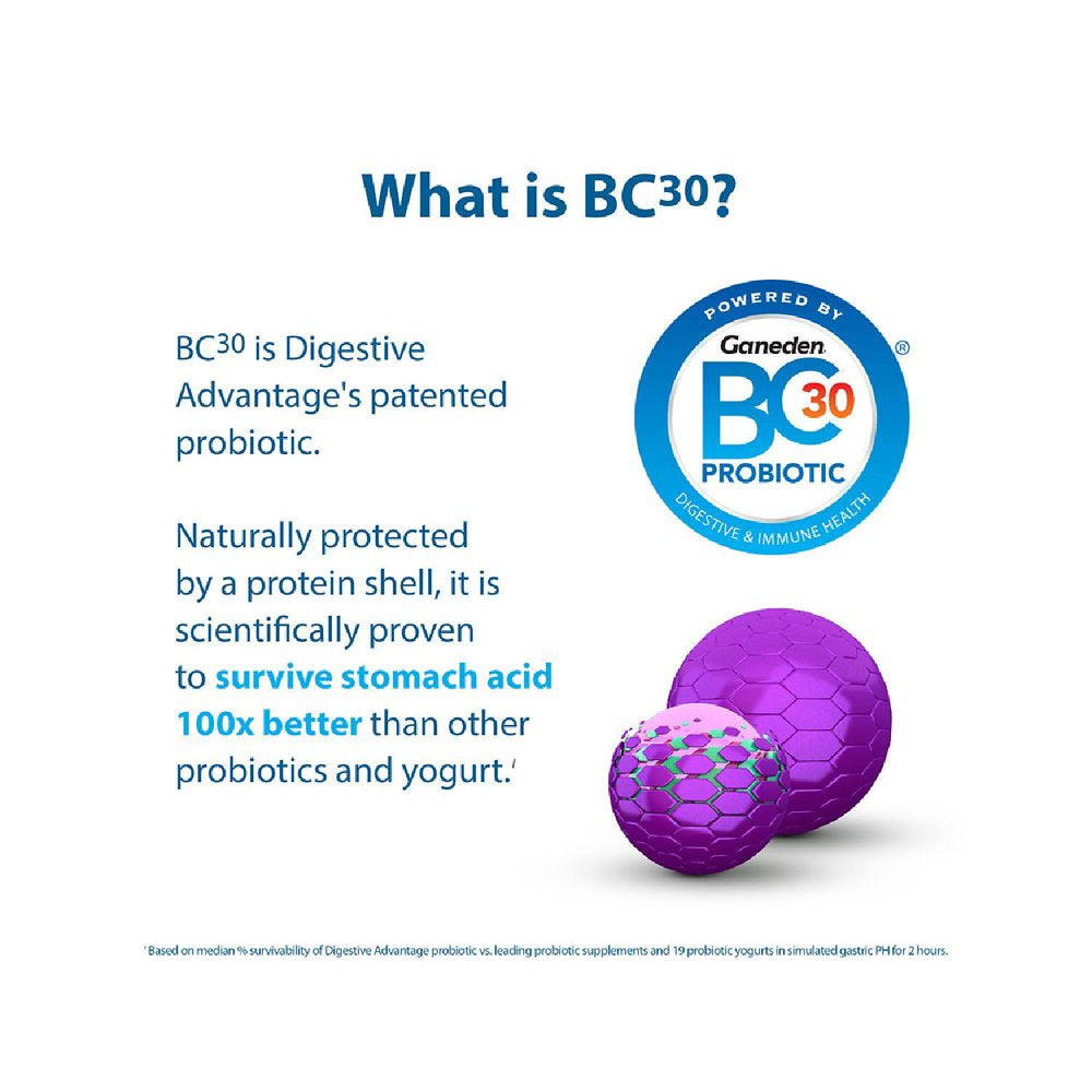 - BC30, the probiotic in Digestive Advantage, survives stomach acid 100x better than leading probiotics and yogurts