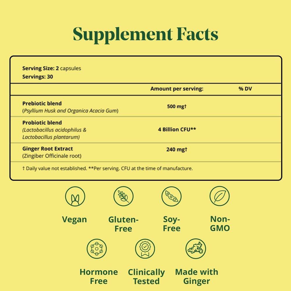 Pre + Probiotic, for Women, Vegan Capsules Dietary Supplement. Vegan. Gluten-free Soy-free. Non-GMO. Natural & effective. Clinically studied. Supports microbiome. Soothes intestines. Reduces bloating. Supports immunity. Get ready for a happy microbiome. The essential supplement for gut health designed specifically for women. Our gut microbiome doesn't just affect our health, immunity, moods and aging - it can even protect us from yeast infections and BV. In Each Capsule: 1. Prebiotic Blend: Helps feed your good bacteria: Psyllium husk; Organic acacia gum. 2. Probiotic Blend: Introduces good bacteria: Lactobacillus acidophilus; Lactobacillus plantarum. 3. Gut Soother: Calms your stomach/intestines: Ginger root extract. Hormone-free. Women owned small business. (This statement has not been evaluated by the Food and Drug Administration. This product is not intended to diagnose, treat, cure, or prevent any disease.) Made in the USA.