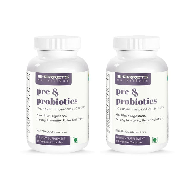 Sharrets Pre and Probiotics 30 B Cfu Gut Health Immunity Supplement Capsules for Men Women, Fos 80Mg 2 X 60'S Counts