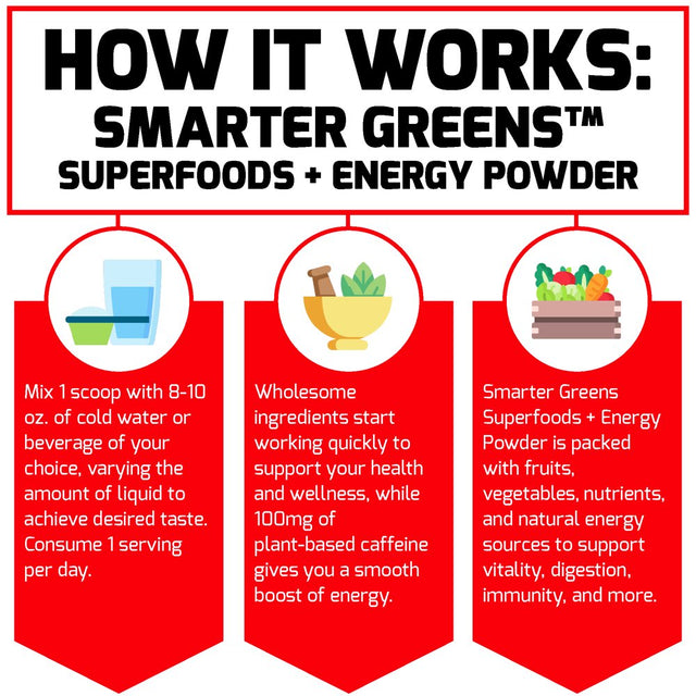 Energize Your Daily Nutrition Coffee may give you energy, but it won’t provide you with the nutrients your body craves to live life with vitality. Smarter Greens Superfoods + Energy Powder does both. With two servings of fruits and vegetables per scoop of this drink mix powder, every sip is packed with 25 essential vitamins, minerals, and antioxidants to support your daily wellness. It also contains a unique blend of plant-based extracts like yerba mate and matcha green tea that provide high quality energy without overstimulation. One scoop and water is all you need. With probiotics, digestive enzymes, and organic fiber to support gut health, and plant-based protein to help keep you fueled, Smarter Greens Superfoods + Energy Powder is a delicious, convenient way to infuse energy and nutrition into your daily routine.
